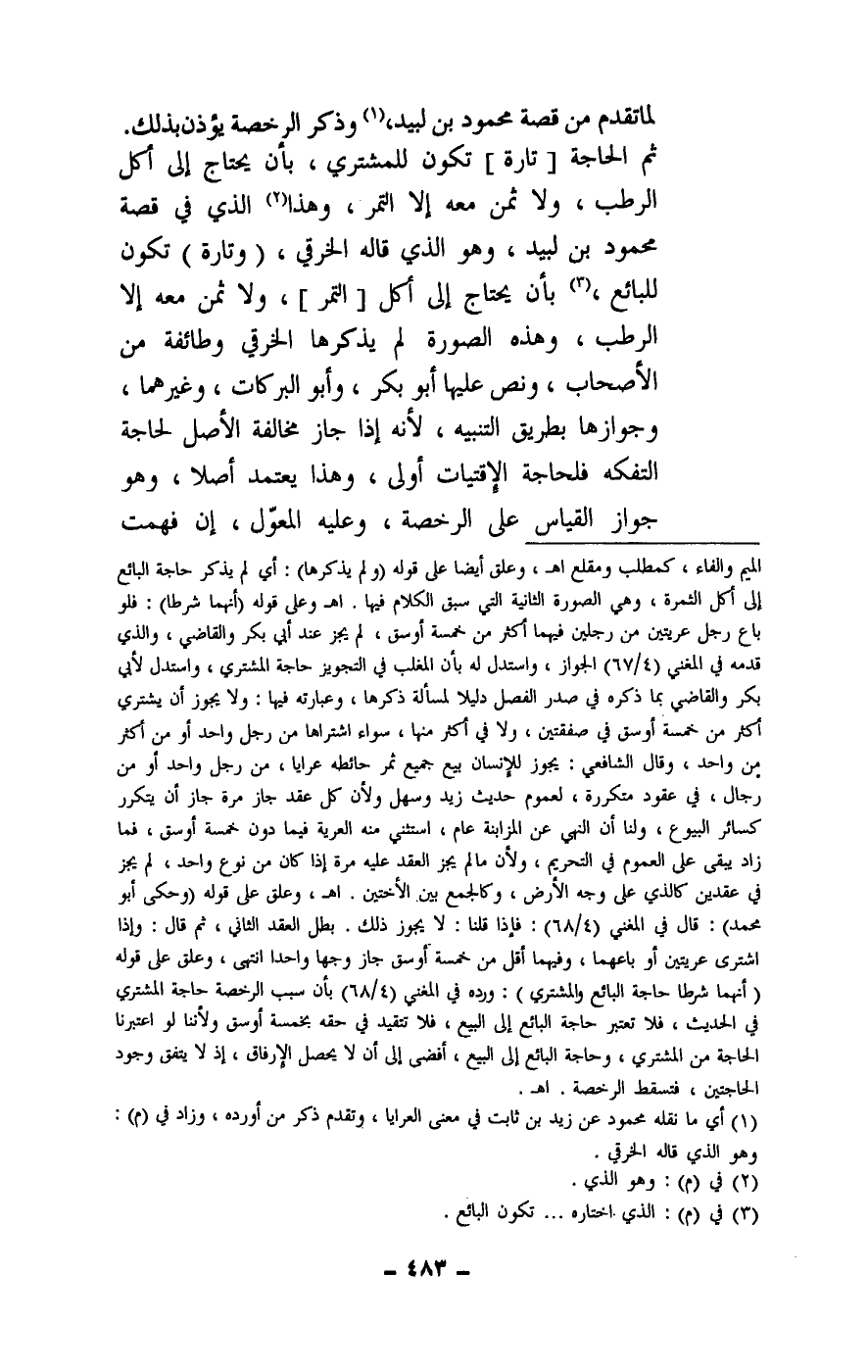 لما تقدم من قصة محمود بن لبيد، وذكر الرخصة يؤذن بذلك. ثم الحاجة [تارة] تكون للمشتري، بأن يحتاج إلى أكل الرطب، ولا ثمن معه إلا التمر، وهذا الذي في قصة محمود بن لبيد، وهو الذي قاله الخرقي، (وتارة) تكون للبائع، بأن يحتاج إلى أكل [التمر] ، ولا ثمن معه إلا الرطب، وهذه الصورة لم يذكرها الخرقي وطائفة من الأصحاب، ونص عليها أبو بكر، وأبو البركات، وغيرهما، وجوازها بطريق التنبيه، لأنه إذا جاز مخالفة الأصل لحاجة التفكه فلحاجة الاقتيات أولى، وهذا يعتمد أصلا، وهو جواز القياس على الرخصة، وعليه المعول، إن فهمت