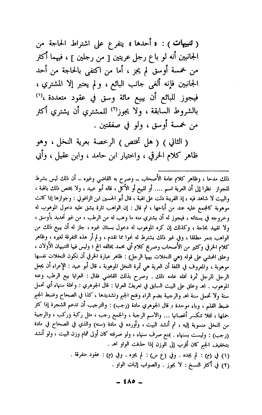 (تنبيهات) : «أحدها» يتفرع على اشتراط الحاجة من الجانبين أنه لو باع رجل عريتين [من رجلين] ، فيهما أكثر من خمسة أوسق لم يجز، أما من اكتفى بالحاجة من أحد الجانبين فإنه ألغى جانب البائع، ولم يعتبر إلا المشتري، فيجوز للبائع أن يبيع مائة وسق في عقود متعددة، بالشروط السابقة، ولا يجوز للمشتري أن يشتري أكثر من خمسة أوسق، ولو في صفقتين.