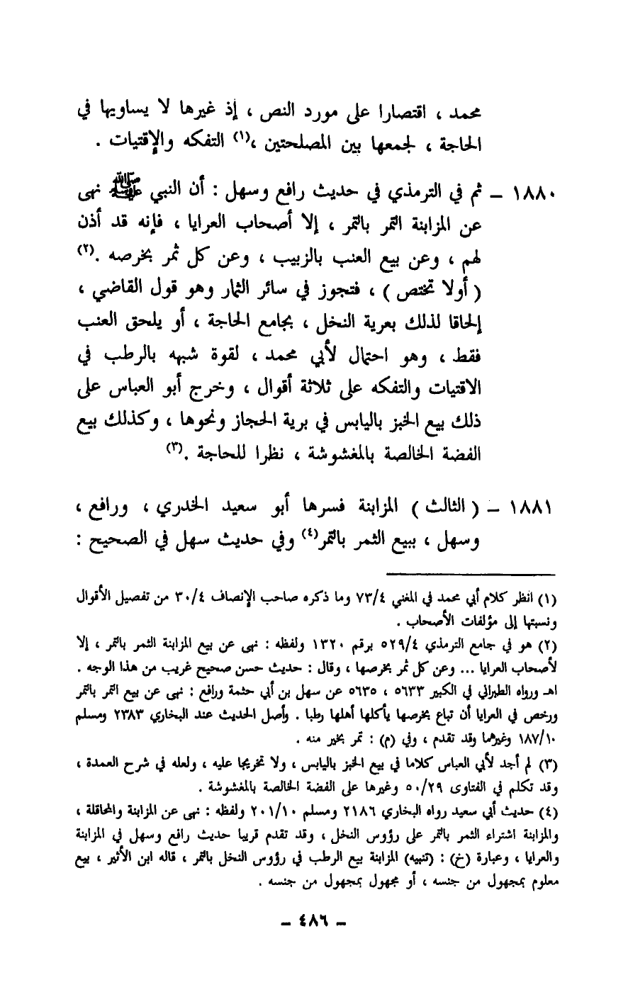 1880 - ثم في الترمذي في حديث رافع وسهل: «أن النبي - صَلَّى اللَّهُ عَلَيْهِ وَسَلَّمَ - نهى عن المزابنة التمر بالتمر، إلا أصحاب العرايا، فإنه قد أذن لهم، وعن بيع العنب بالزبيب، وعن كل ثمر بخرصه» .