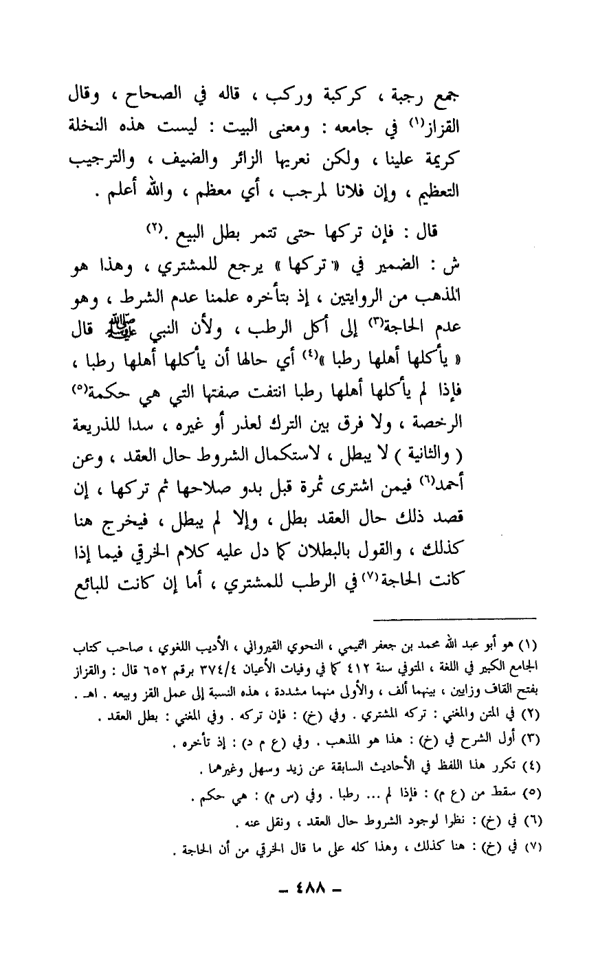 ش: الضمير في «تركها» يرجع للمشتري، وهذا هو المذهب من الروايتين، إذ بتأخره علمنا عدم الشرط، وهو عدم الحاجة إلى أكل الرطب، ولأن النبي - صَلَّى اللَّهُ عَلَيْهِ وَسَلَّمَ - قال: يأكلها أهلها رطبا أي حالها أن يأكلها أهلها رطبا، فإذا لم يأكلها أهلها رطبا انتفت صفتها التي هي حكمة الرخصة، ولا فرق بين الترك لعذر أو غيره، سدا للذريعة (والثانية) لا يبطل، لاستكمال الشروط حال العقد، وعن أحمد فيمن اشترى ثمرة قبل بدو صلاحها ثم تركها، إن قصد ذلك حال العقد بطل، وإلا لم يبطل، فيخرج هنا كذلك، والقول بالبطلان كما دل عليه كلام الخرقي فيما إذا كانت الحاجة في الرطب للمشتري، أما إن كانت للبائع