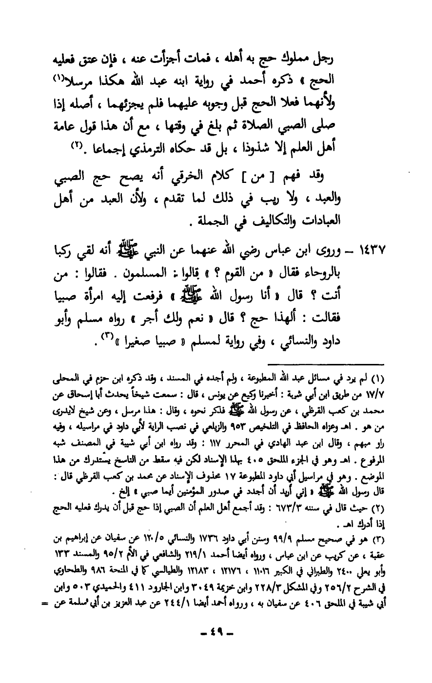 1437 - وروى ابن عباس - رَضِيَ اللَّهُ عَنْهُمَا - «عن النبي - صَلَّى اللَّهُ عَلَيْهِ وَسَلَّمَ - أنه لقي ركبا بالروحاء فقال «من القوم؟» قالوا: المسلمون. فقالوا: من أنت؟ قال «أنا رسول الله - صَلَّى اللَّهُ عَلَيْهِ وَسَلَّمَ -» فرفعت إليه امرأة صبيا فقالت: ألهذا حج؟ قال «نعم، ولك أجر» رواه مسلم، وأبو داود، والنسائي، وفي رواية لمسلم «صبيا صغيرا» .