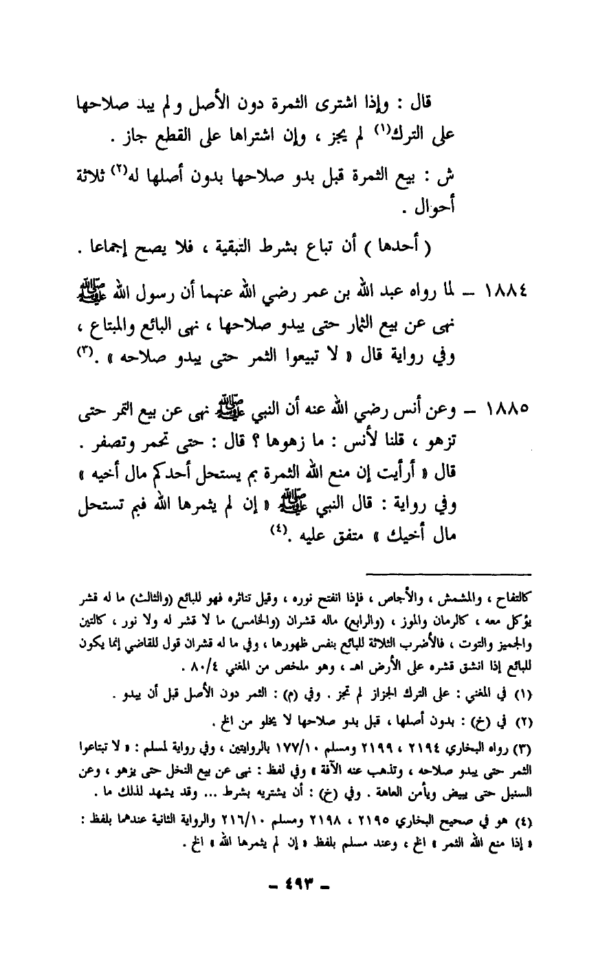 1884 - لما رواه عبد الله بن عمر - رَضِيَ اللَّهُ عَنْهُمَا - «أن رسول الله - صَلَّى اللَّهُ عَلَيْهِ وَسَلَّمَ - نهى عن بيع الثمار حتى يبدو صلاحها، نهى البائع والمبتاع، وفي رواية قال: لا تبيعوا الثمر حتى يبدو صلاحه» .