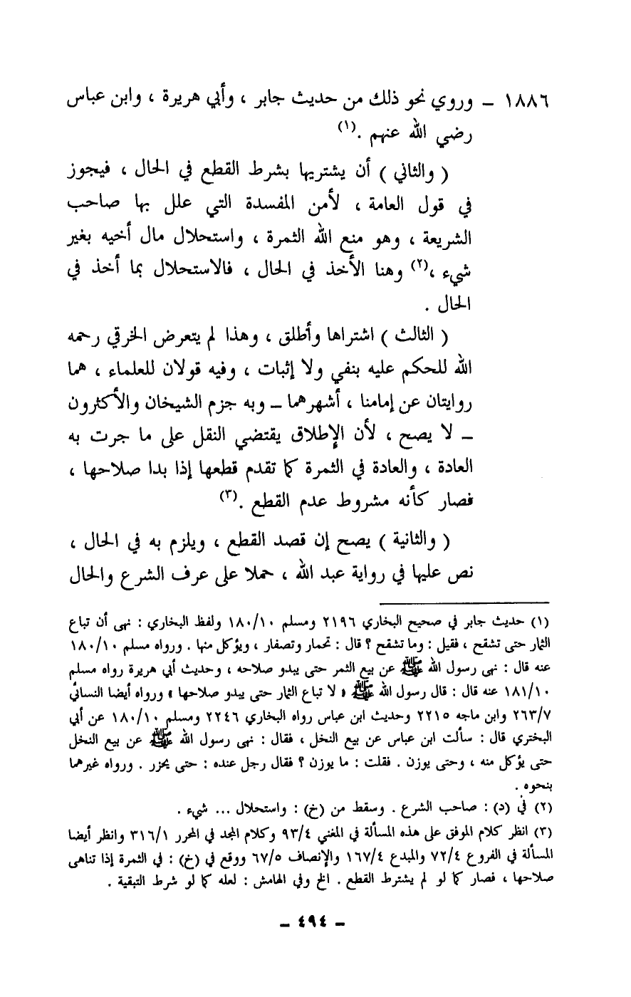 (الثالث) : اشتراها وأطلق، وهذا لم يتعرض الخرقي - رَحِمَهُ اللَّهُ - للحكم عليه بنفي ولا إثبات، وفيه قولان للعلماء، هما روايتان عن إمامنا، أشهرهما - وبه جزم الشيخان والأكثرون - لا يصح، لأن الإطلاق يقتضي النقل على ما جرت به العادة، والعادة في الثمرة كما تقدم قطعها إذا بدا صلاحها، فصار كأنه مشروط عدم القطع.