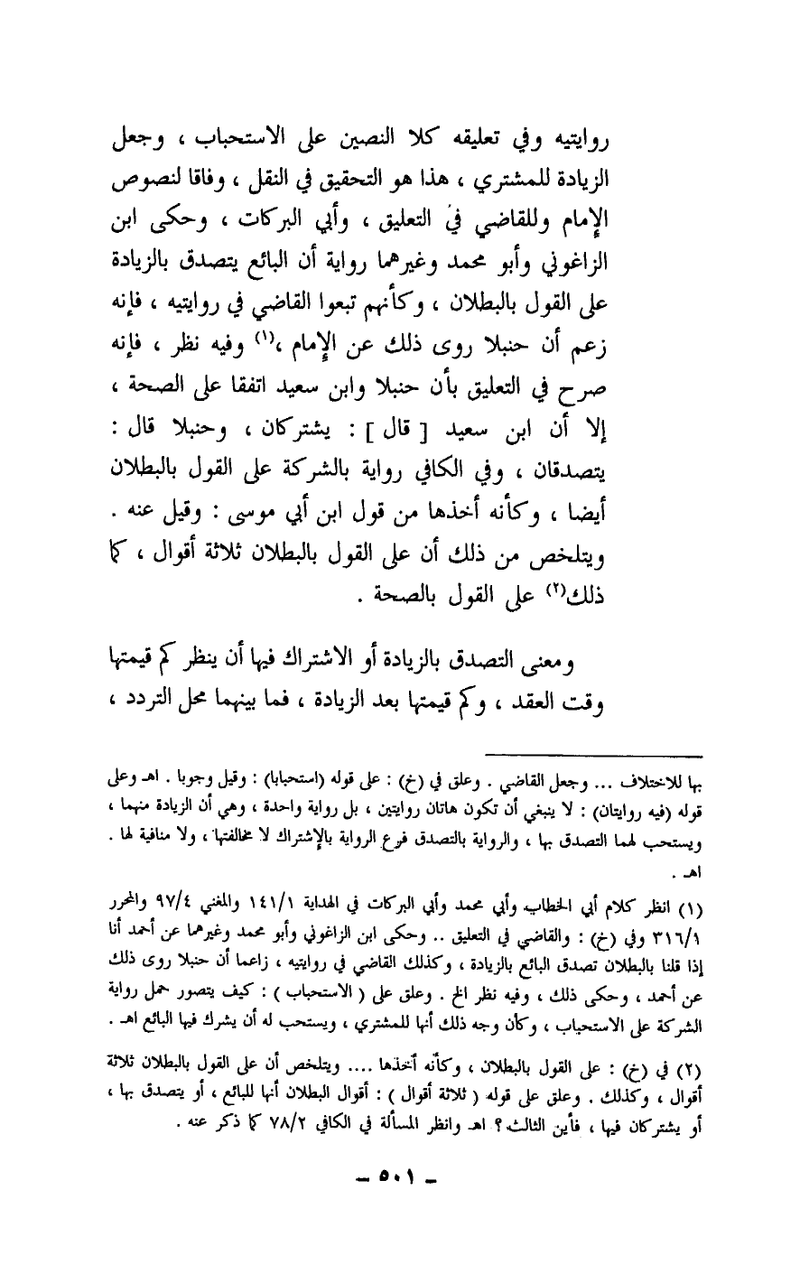 روايتيه وفي تعليقه كلا النصين على الاستحباب، وجعل الزيادة للمشتري، هذا هو التحقيق في النقل، وفاقا لنصوص الإمام وللقاضي في التعليق، وأبي البركات، وحكى ابن الزاغوني وأبو محمد وغيرهما رواية أن البائع يتصدق بالزيادة على القول بالبطلان، وكأنهم تبعوا القاضي في روايتيه، فإنه زعم أن حنبلا روى ذلك عن الإمام، وفيه نظر، فإنه صرح في التعليق بأن حنبلا وابن سعيد اتفقا على الصحة، إلا أن ابن سعيد [قال] : يشتركان، وحنبلا قال: يتصدقان، وفي الكافي رواية بالشركة على القول بالبطلان أيضا، وكأنه أخذها من قول ابن أبي موسى: وقيل عنه. ويتلخص من ذلك أن على القول بالبطلان ثلاثة أقوال، كما ذلك على القول بالصحة.