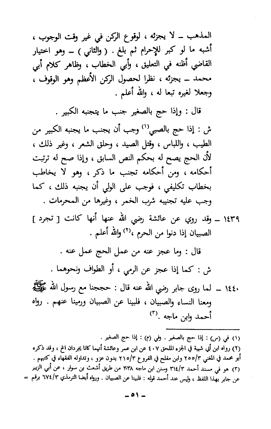 1440 - لما «روى جابر - رَضِيَ اللَّهُ عَنْهُ - قال: حججنا مع رسول الله - صَلَّى اللَّهُ عَلَيْهِ وَسَلَّمَ - ومعنا النساء والصبيان، فلبينا عن الصبيان ورمينا عنهم» . رواه أحمد، وابن ماجه.