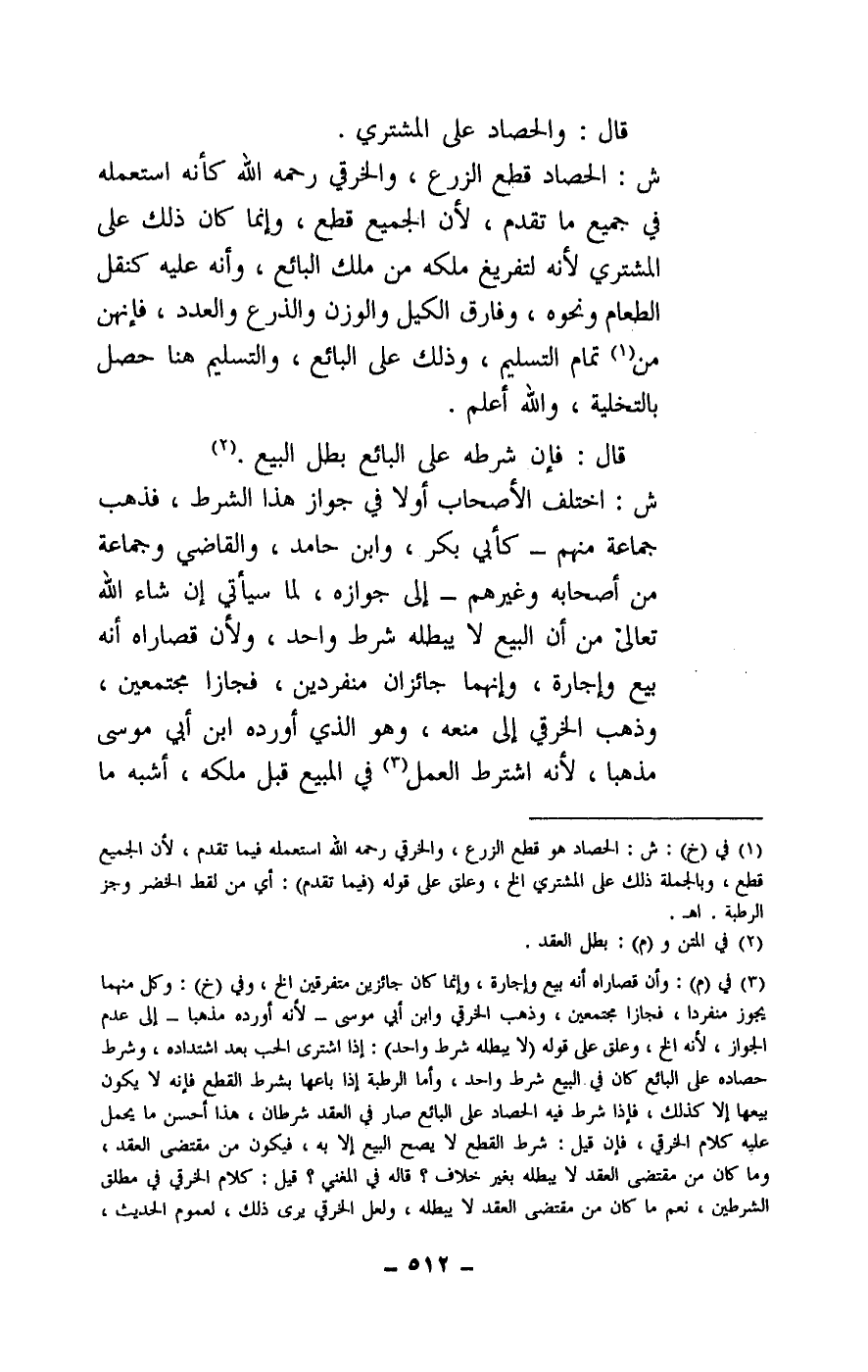 ش: الحصاد قطع الزرع، والخرقي - رَحِمَهُ اللَّهُ - كأنه استعمله في جميع ما تقدم، لأن الجميع قطع، وإنما كان ذلك على المشتري لأنه لتفريغ ملكه عن ملك البائع، وأنه عليه كنقل الطعام ونحوه، وفارق الكيل والوزن والذرع والعدد، فإنهن من تمام التسليم، وذلك على البائع، والتسليم هنا حصل بالتخلية، والله أعلم.