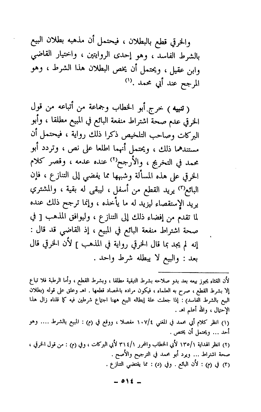 (تنبيه) : خرج أبو الخطاب وجماعة من أتباعه من قول الخرقي عدم صحة اشتراط منفعة البائع في المبيع مطلقا، وأبو البركات وصاحب التلخيص ذكرا ذلك رواية، فيحتمل أن مستندهما ذلك، ويحتمل أنهما اطلعا على نص، وتردد أبو محمد في التخريج، والأرجح عنده عدمه، وقصر كلام الخرقي على هذه المسألة وشبهها مما يفضي إلى التنازع، فإن البائع يريد القطع من أسفل، ليبقى له بقية، والمشتري يريد الاستقصاء ليزيد له ما يأخذه، وإنما ترجح ذلك عنده لما تقدم من إفضاء ذلك إلى التنازع، وليوافق المذهب [في صحة اشتراط منفعة البائع في المبيع، إذ القاضي قد قال: إنه لم يجد بما قال الخرقي رواية في المذهب] لأن الخرقي قال بعد: والبيع لا يبطله شرط واحد.