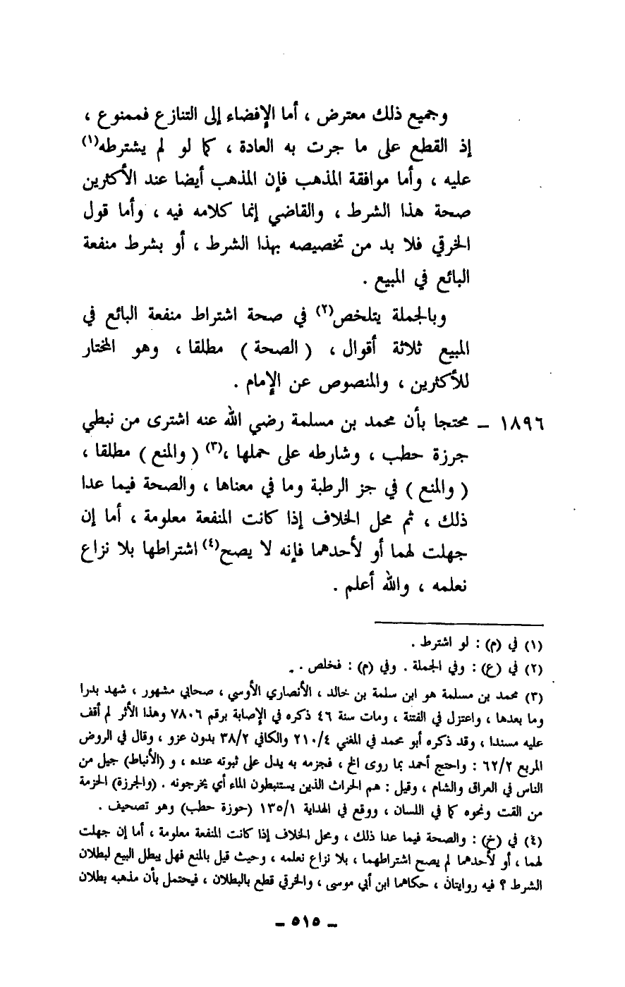 1896 - محتجا بأن محمد بن مسلمة - رَضِيَ اللَّهُ عَنْهُ - اشترى من نبطي جزرة حطب، وشارطه على حملها، (والمنع) مطلقا، (والمنع) في جز الرطبة وما في معناها، والصحة فيما عدا ذلك، ثم محل الخلاف إذا كانت المنفعة معلومة، أما إن جهلت لهما أو لأحدهما فإنه لا يصح اشتراطها بلا نزاع نعلمه، والله أعلم.
