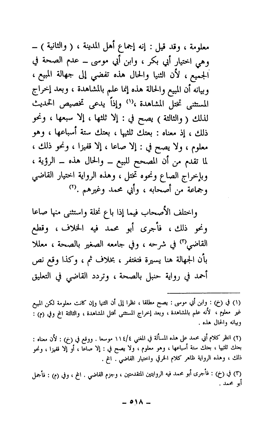 معلومة، وقد قيل: إنه إجماع أهل المدينة، (والثانية) : - وهي اختيار أبي بكر، وابن أبي موسى - عدم الصحة في الجميع، لأن الثنيا والحال هذه تفضي إلى جهالة المبيع، وبيانه أن المبيع والحالة هذه إنما علم بالمشاهدة، وبعد إخراج المستثنى تختل المشاهدة، وإذا يدعى تخصيص الحديث لذلك (والثالثة) : يصح في: إلا ثلثها، إلا سبعها، ونحو ذلك، إذ معناه، بعتك ثلثيها، بعتك ستة أسباعها، وهو معلوم، ولا يصح في: إلا صاعا، إلا قفيزا، ونحو ذلك، لما تقدم من أن المصحح للبيع - والحال هذه - الرؤية، وبإخراج الصاع ونحوه تختل، وهذه الرواية اختيار القاضي وجماعة من أصحابه، وأبي محمد وغيرهم.