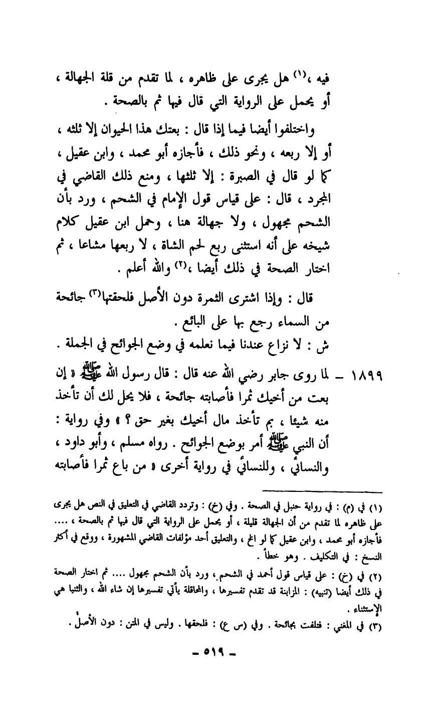 1899 - لما روى جابر - رَضِيَ اللَّهُ عَنْهُ - قال: قال رسول الله - صَلَّى اللَّهُ عَلَيْهِ وَسَلَّمَ - «إن بعت من أخيك ثمرا فأصابته جائحة، فلا يحل لك أن تأخذ منه شيئا، بم تأخذ من مال أخيك بغير حق؟» وفي رواية: «أن النبي - صَلَّى اللَّهُ عَلَيْهِ وَسَلَّمَ - أمر بوضع الجوائح» . رواه مسلم، وأبو داود، والنسائي، وللنسائي في رواية أخرى «من باع ثمرا فأصابته
