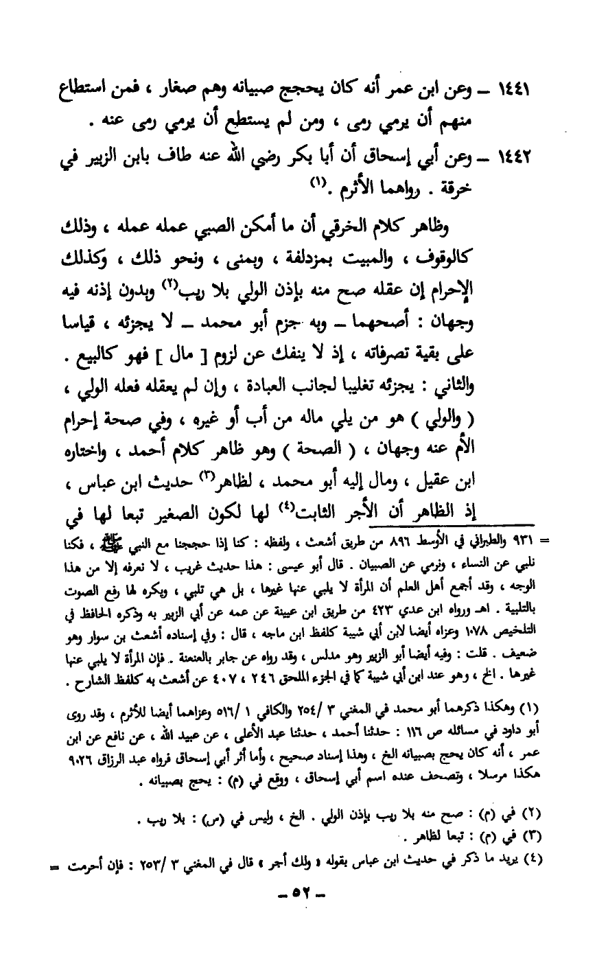 1441 - وعن ابن عمر أنه كان يحجج صبيانه وهم صغار، فمن استطاع منهم أن يرمي رمى، ومن لم يستطع أن يرمي رمى عنه.