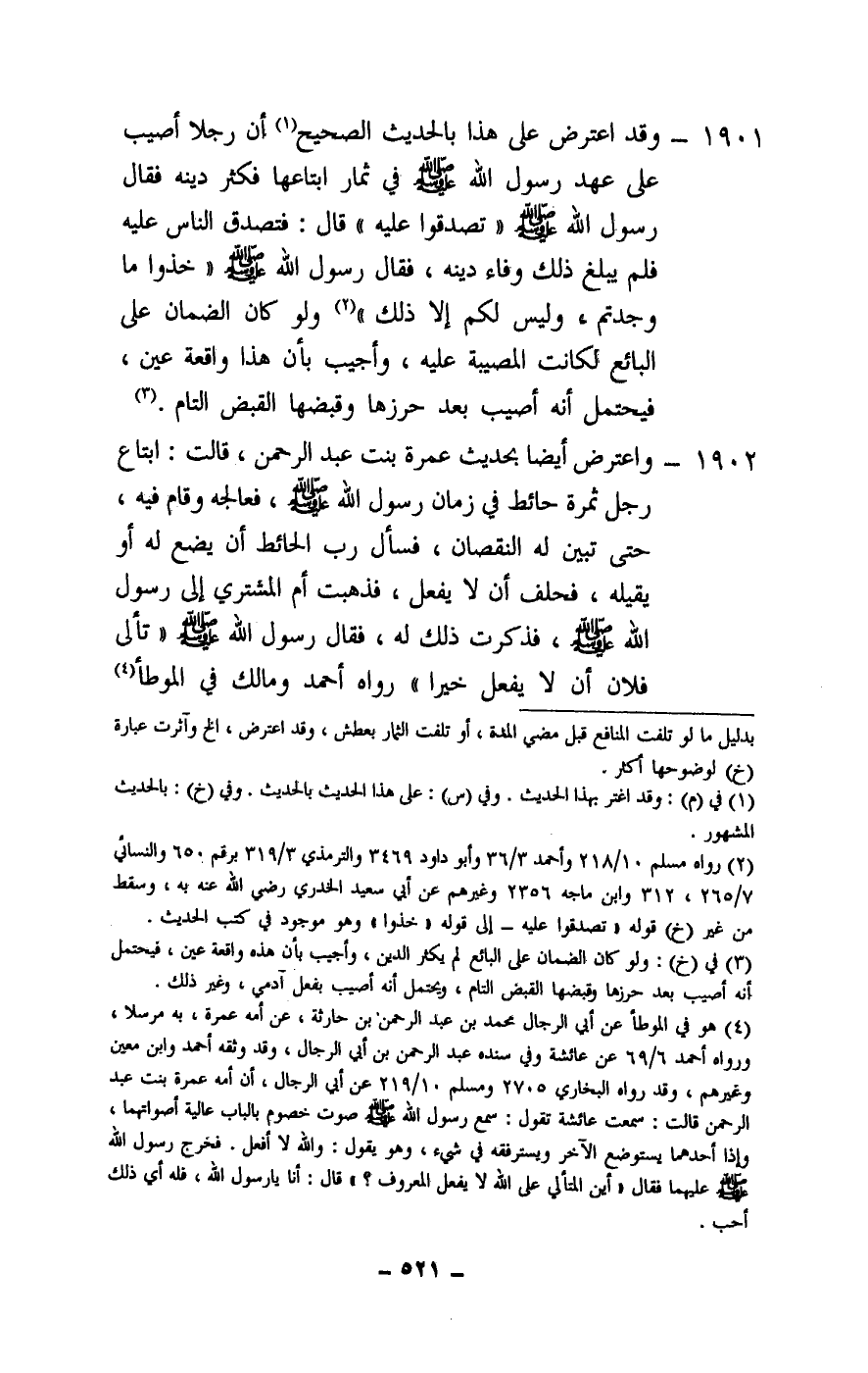 1901 - وقد اعترض على هذا بالحديث الصحيح «أن رجلا أصيب على عهد رسول الله - صَلَّى اللَّهُ عَلَيْهِ وَسَلَّمَ - في ثمار ابتاعها فكثر دينه، فقال رسول الله - صَلَّى اللَّهُ عَلَيْهِ وَسَلَّمَ -: «تصدقوا عليه» ، قال: فتصدق الناس عليه فلم يبلغ ذلك وفاء دينه، فقال رسول الله - صَلَّى اللَّهُ عَلَيْهِ وَسَلَّمَ -: «خذوا ما وجدتم، وليس لكم إلا ذلك» ولو كان الضمان على البائع لكانت المصيبة عليه، وأجيب بأن هذا واقعة عين، فيحتمل أنه أصيب بعد حرزها وقبضها القبض التام.