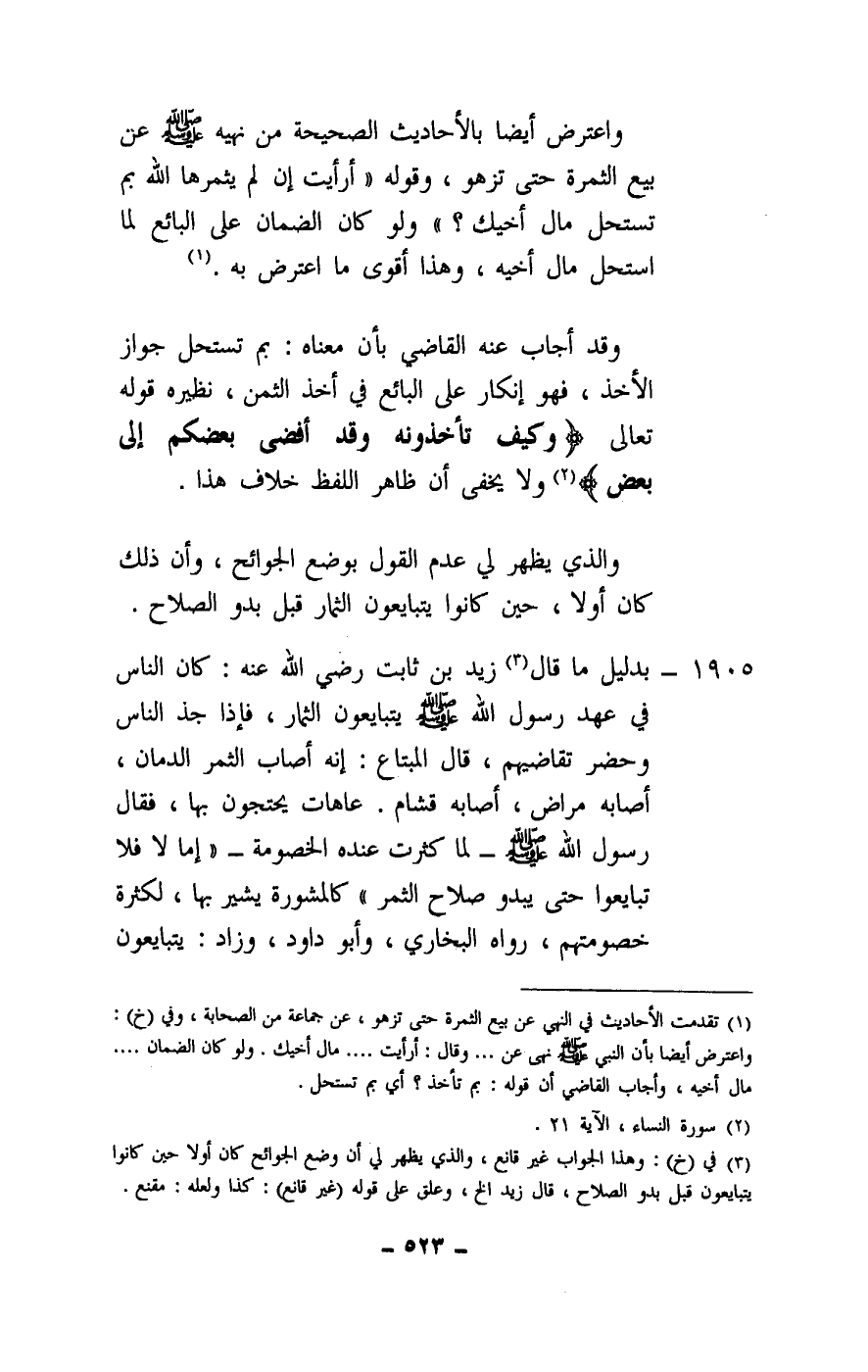 1905 - بدليل ما قال زيد بن ثابت - رَضِيَ اللَّهُ عَنْهُ -: «كان الناس في عهد رسول الله - صَلَّى اللَّهُ عَلَيْهِ وَسَلَّمَ - يتبايعون الثمار، فإذا جذ الناس وحضر تقاضيهم، قال المبتاع: إنه أصاب الثمر الدمان، أصابه مراض، أصابه قشام، عاهات يحتجون بها، فقال رسول الله - صَلَّى اللَّهُ عَلَيْهِ وَسَلَّمَ - لما كثرت عنده الخصومة -: «إما لا فلا تبايعوا حتى يبدو صلاح الثمر» كالمشورة يشير بها، لكثرة خصومتهم، رواه البخاري، وأبو داود، وزاد: «يتبايعون