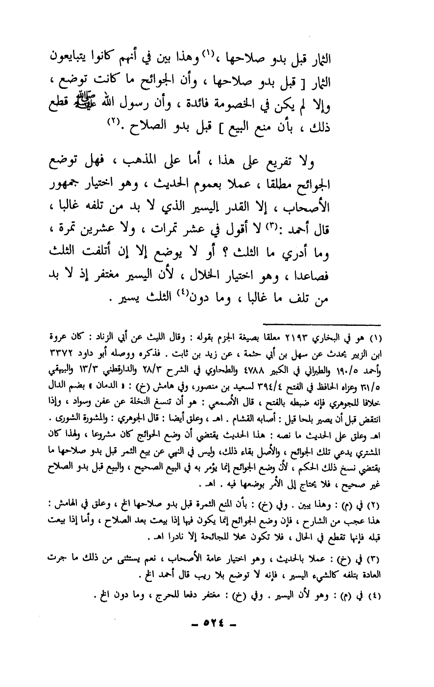 ولا تفريع على هذا، أما على المذهب، فهل توضع الجوائح مطلقا، عملا بعموم الحديث، وهو اختيار جمهور الأصحاب، إلا القدر اليسير الذي لا بد من تلفه غالبا، قال أحمد: لا أقول في عشر تمرات، ولا عشرين تمرة، وما أدري ما الثلث؟ أو لا يوضع إلا أن أتلفت الثلث فصاعدا، وهو اختيار الخلال، لأن اليسير مغتفر إذ لا بد من تلف ما غالبا، وما دون الثلث يسير.