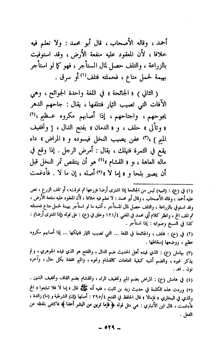 (الثاني) : «الجائحة» في اللغة واحدة الجوائح، وهي الآفات التي تصيب الثمار فتتلفها، يقال: جاحهم الدهر يجوحهم، واجتاحهم، إذا أصابهم مكروه عظيم، «وتألى» حلف، و «الدمان» بفتح الدال، [وتخفيف الميم] ، عفن يصيب النخل فيسوده، و «المراض» داء يقع في الثمرة فتهلك، يقال: أمرض الرجل. إذا وقع في ماله العاهة، و «القشام» هو أن ينتقص ثمر النخل قبل أن يصير بلحا، و «إما لا» أصله، إن ما لا. فأدغمت