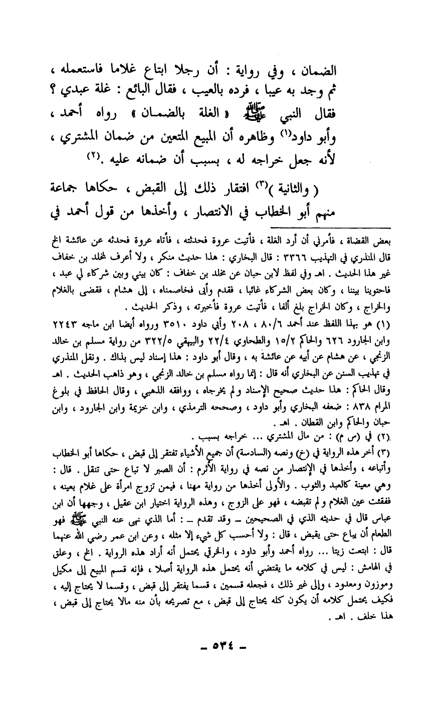 الضمان، وفي رواية: «أن رجلا ابتاع غلاما فاستعمله، ثم وجد به عيبا، فرده بالعيب، فقال البائع: غلة عبدي؟ فقال النبي - صَلَّى اللَّهُ عَلَيْهِ وَسَلَّمَ -: «الغلة بالضمان» رواه أحمد، وأبو داود، وظاهره أن المبيع المتعين من ضمان المشتري، لأنه جعل خراجه له، بسبب أن ضمانه عليه.