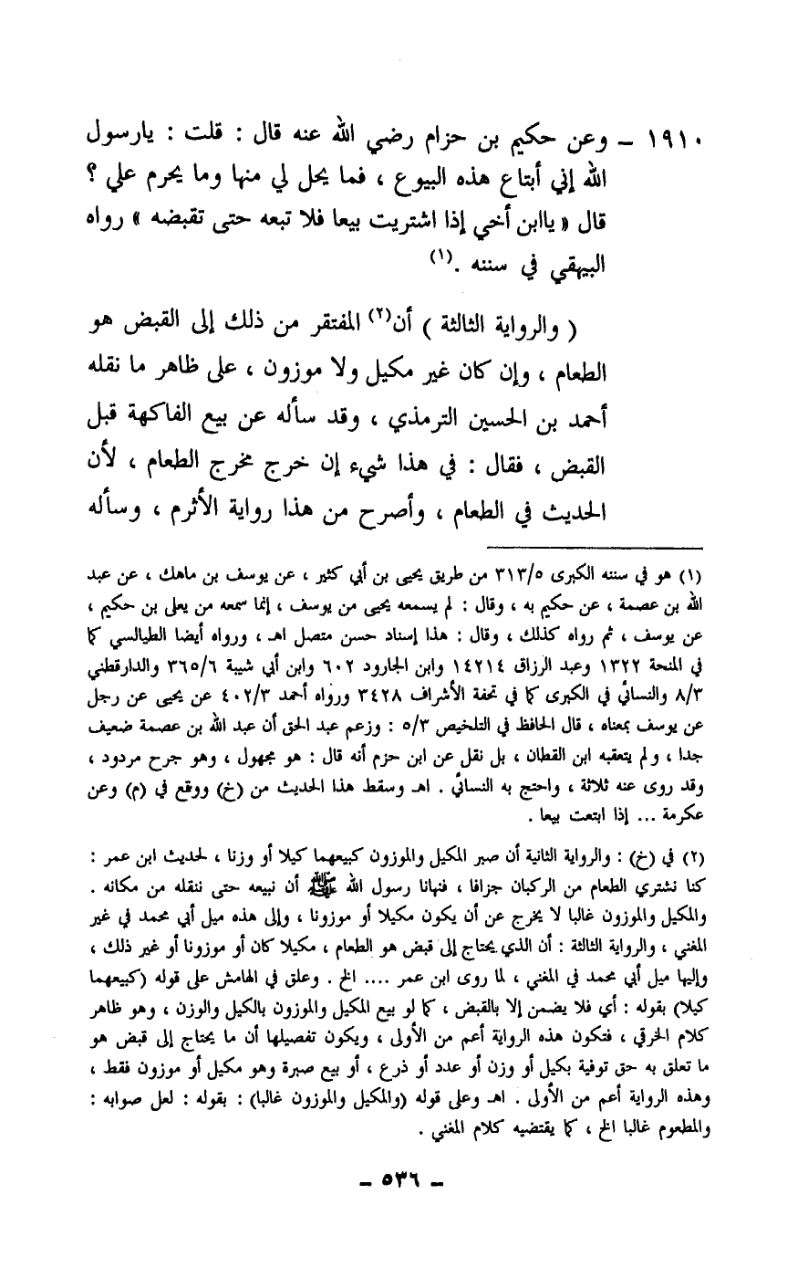 1910 - وعن «حكيم بن حزام - رَضِيَ اللَّهُ عَنْهُ - قال: قلت: يا رسول الله، إني أبتاع هذه البيوع، فما يحل لي منها وما يحرم علي؟ قال «يا بن أخي إذا اشتريت بيعا فلا تبعه حتى تقبضه» رواه البيهقي في سننه.