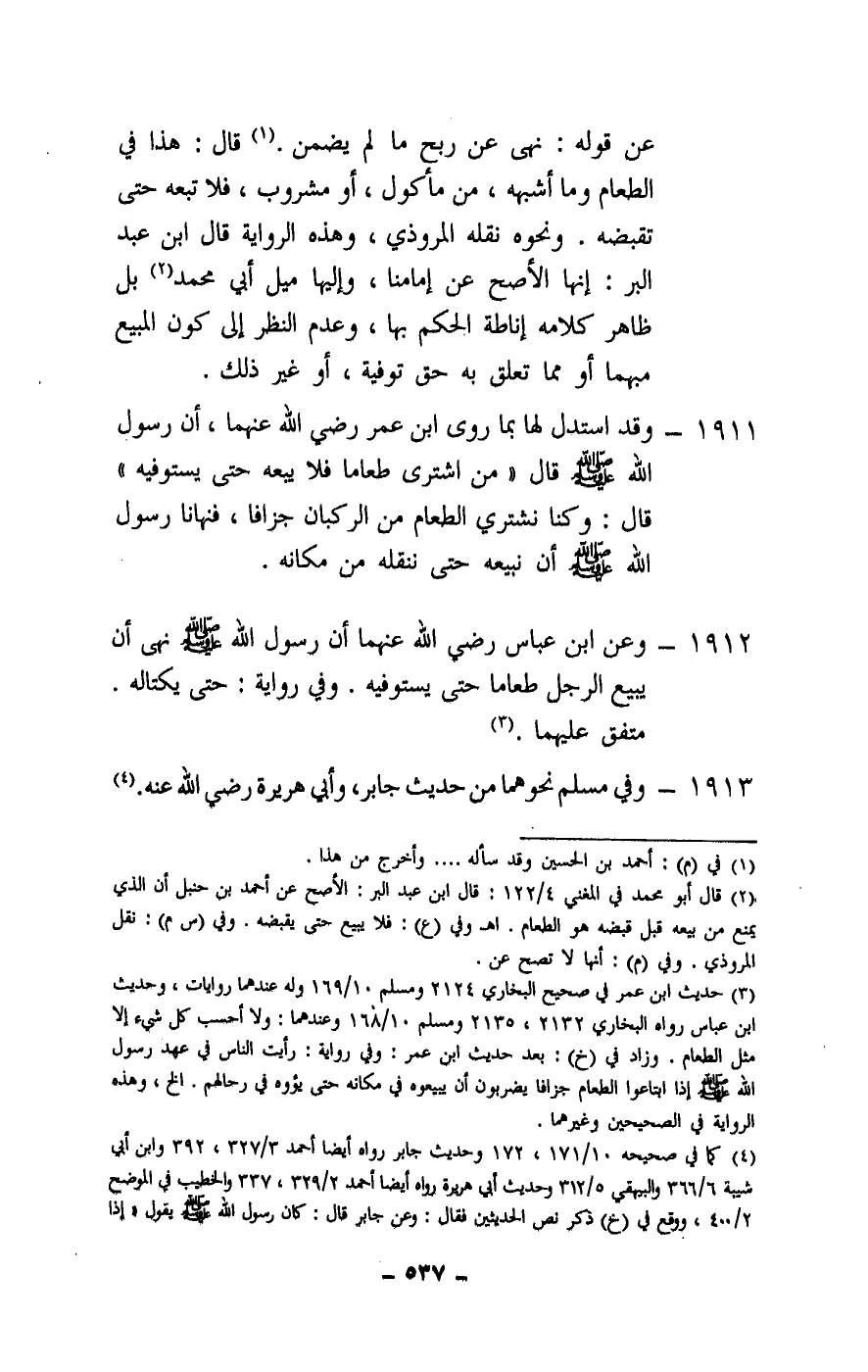1911 - وقد استدل لها بما روى ابن عمر - رَضِيَ اللَّهُ عَنْهُمَا -، أن رسول الله - صَلَّى اللَّهُ عَلَيْهِ وَسَلَّمَ -، قال: «من اشترى طعاما فلا يبعه حتى يستوفيه» قال: وكنا نشتري الطعام من الركبان جزافا، فنهانا رسول الله - صَلَّى اللَّهُ عَلَيْهِ وَسَلَّمَ - أن نبيعه حتى ننقله من مكانه» .