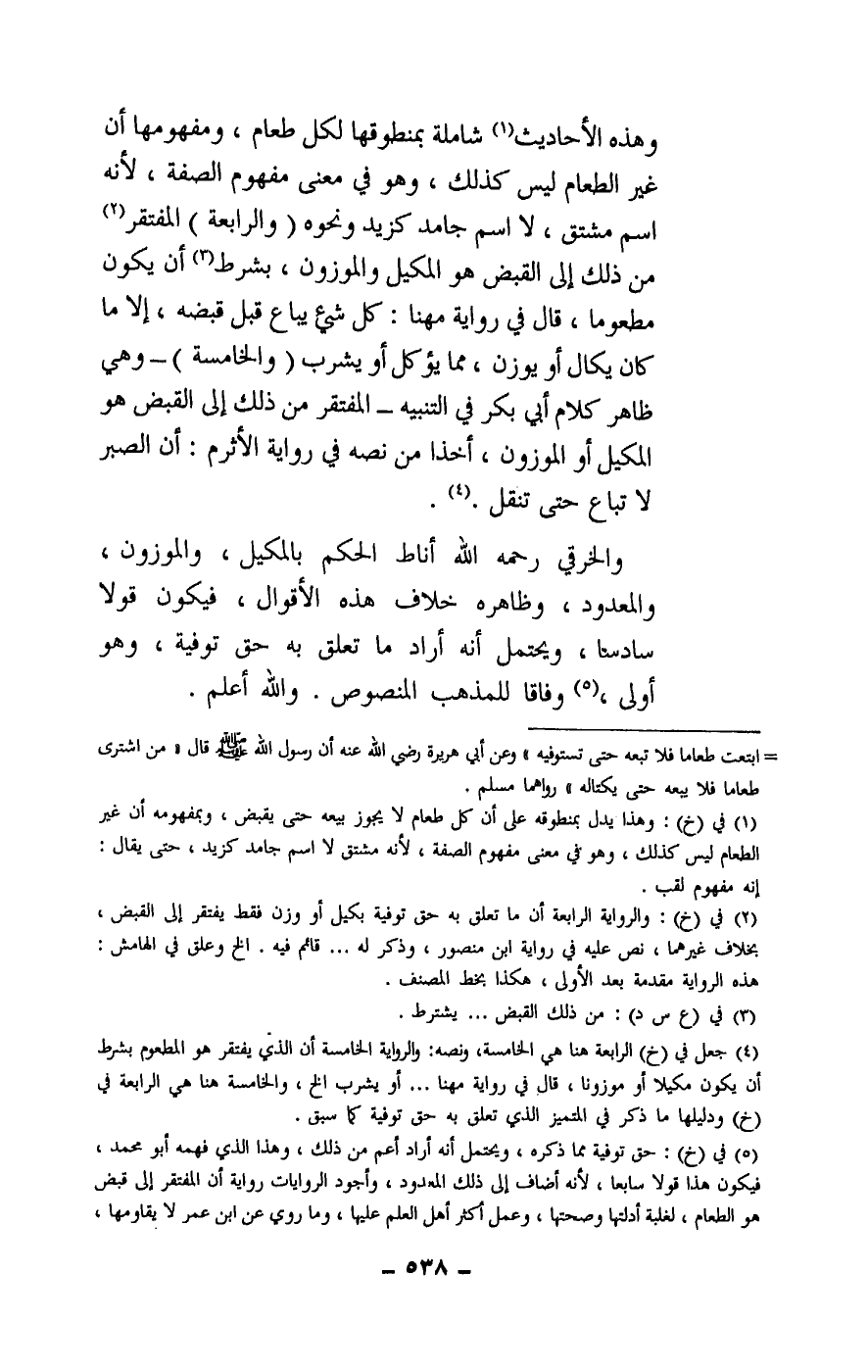والخرقي - رَحِمَهُ اللَّهُ - أناط الحكم بالمكيل، والموزون والمعدود، وظاهره خلاف هذه الأقوال، فيكون قولا سادسا، ويحتمل أنه أراد ما تعلق به حق توفية، وهو أولى، وفاقا للمذهب المنصوص. والله أعلم.