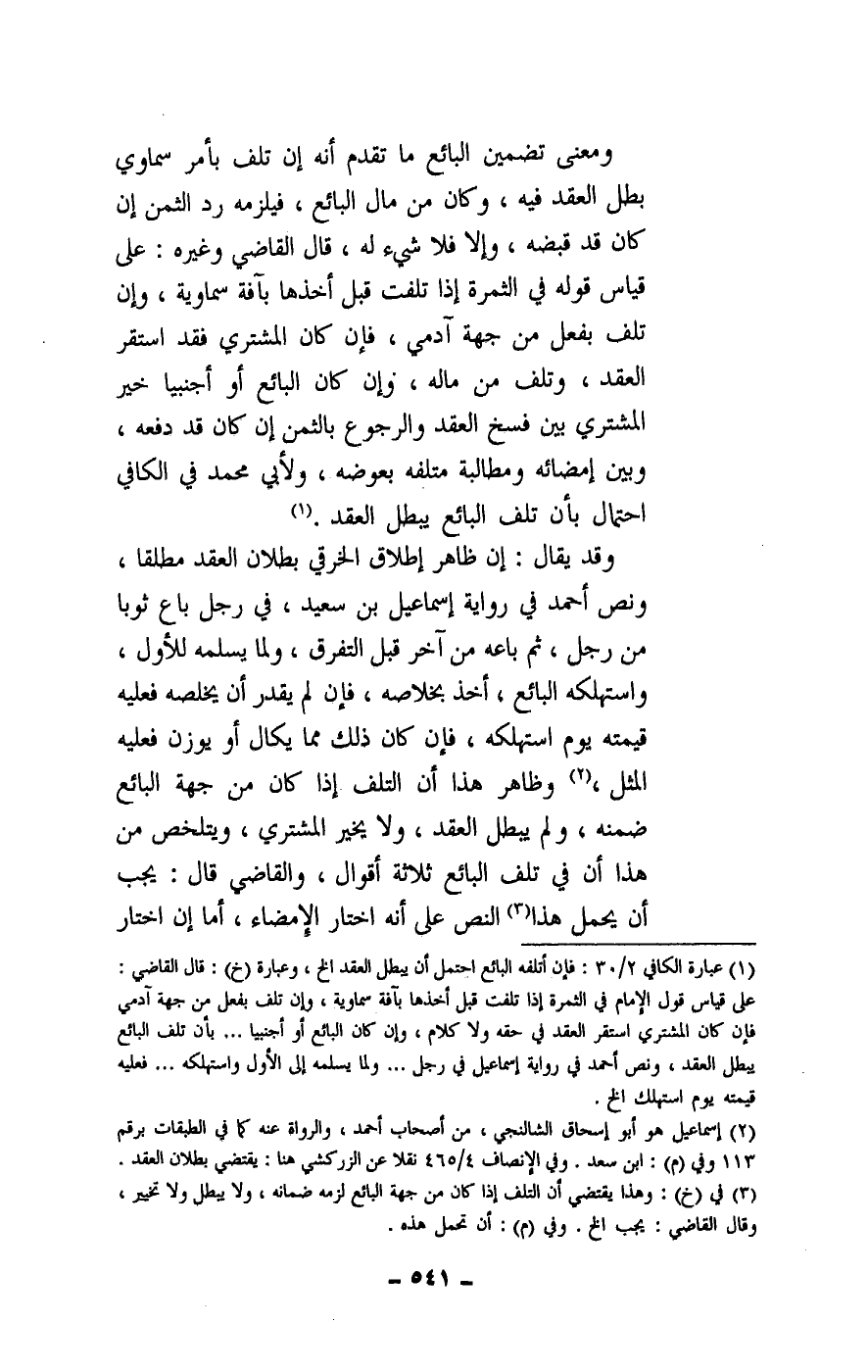 ومعنى تضمين البائع ما تقدم أنه إن تلف بأمر سماوي بطل العقد فيه، وكان من مال البائع، فيلزمه رد الثمن إن كان قد قبضه، وإلا فلا شيء له، قال القاضي وغيره: على قياس قوله في الثمرة إذا تلفت قبل أخذها بآفة سماوية، وإن تلف بفعل من جهة آدمي، فإن كان المشتري فقد استقر العقد، وتلف من ماله، وإن كان البائع أو أجنبيا خير المشتري بين فسخ العقد والرجوع بالثمن إذا كان قد دفعه، وبين إمضائه ومطالبة متلفه بعوضه، ولأبي محمد في الكافي احتمال بأن تلف البائع يبطل العقد. وقد يقال: إن ظاهر إطلاق الخرقي بطلان العقد مطلقا، ونص أحمد في رواية إسماعيل بن سعيد، في رجل باع ثوبا من رجل، ثم باعه من آخر قبل التفرق، ولما يسلمه للأول، واستهلكه البائع، أخذ بخلاصه، فإن لم يقدر أن يخلصه فعليه قيمته يوم استهلكه، فإن كان ذلك مما يكال أو يوزن فعليه المثل، وظاهر هذا أن التلف إذا كان من جهة البائع ضمنه، ولم يبطل العقد، ولا يخير المشتري، ويتلخص من هذا أن في تلف البائع ثلاثة أقوال، والقاضي قال: يجب أن يحمل هذا النص على أنه اختار الإمضاء، أما إن اختار