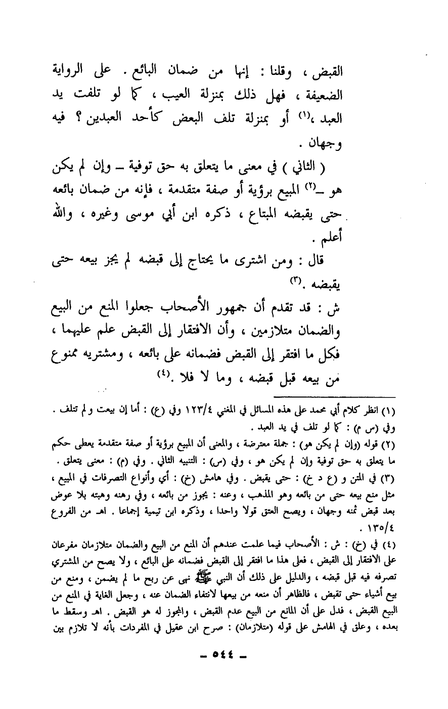 (الثاني) : في معنى ما يتعلق به حق توفية - وإن لم يكن هو - المبيع برؤية أو صفة متقدمة، فإنه من ضمان بائعه حتى يقبضه المبتاع، ذكره ابن أبي موسى وغيره، والله أعلم.