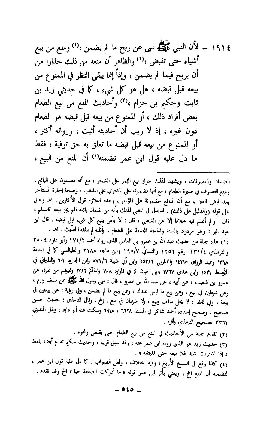 1914 - لأن «النبي - صَلَّى اللَّهُ عَلَيْهِ وَسَلَّمَ - نهى عن ربح ما لم يضمن» ، ومنع من بيع أشياء حتى تقبض، والظاهر أن منعه من ذلك حذارا من أن يربح فيما لم يضمن، وإذا إنما يبقى النظر في الممنوع من بيعه قبل قبضه، هل هو كل شيء، كما في حديثي زيد بن ثابت، وحكيم بن حزام، وأحاديث المنع من بيع الطعام بعض أفراد ذلك، أو الممنوع من بيعه قبل قبضه هو الطعام دون غيره، إذ لا ريب أن أحاديثه أثبت، ورواته أكثر، أو الممنوع من بيعه قبل قبضه ما تعلق به حق توفية، فقط ما دل عليه قول ابن عمر تضمنه أن المنع من البيع،