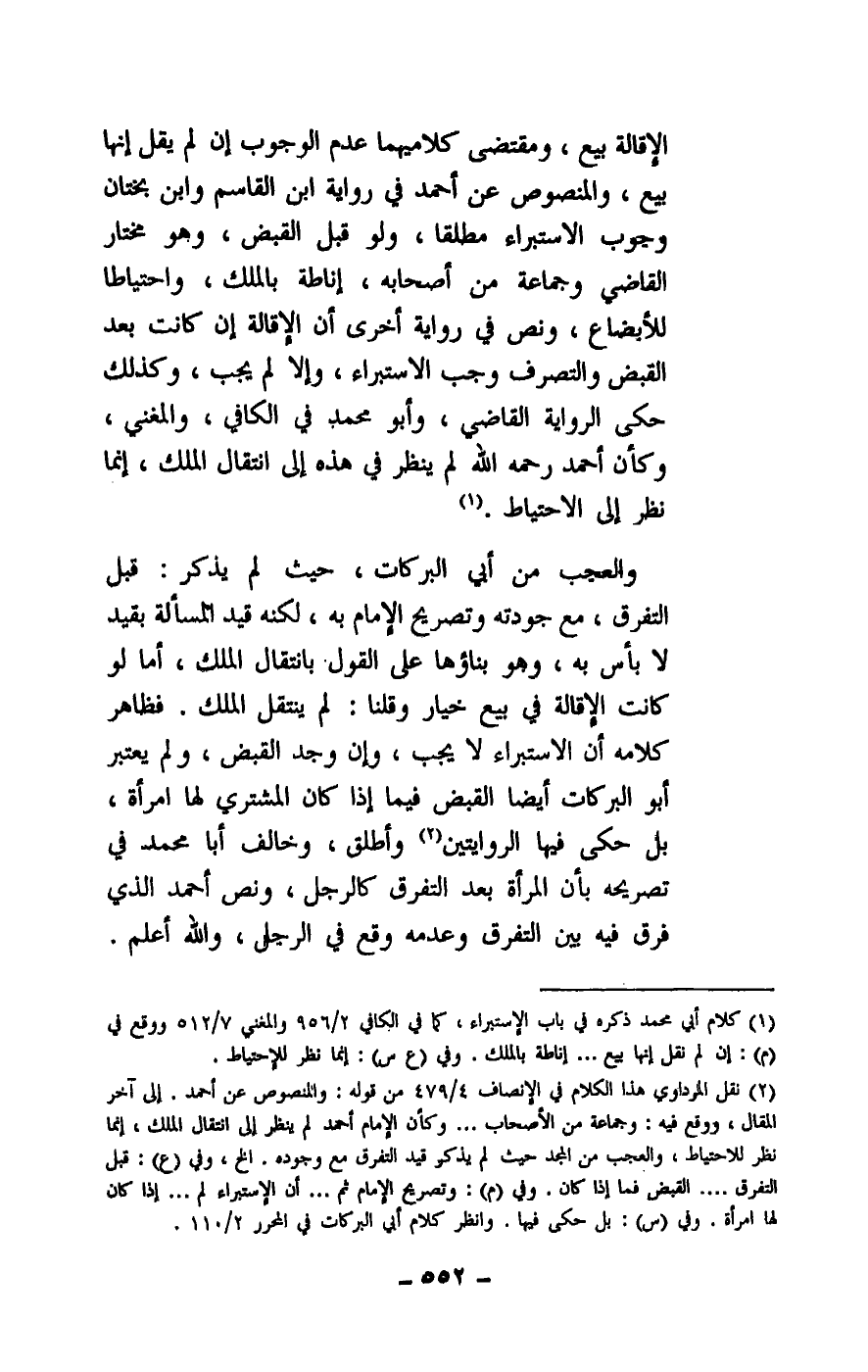 والعجب من أبي البركات، حيث لم يذكر: قبل التفرق، مع جودته وتصريح الإمام به، لكنه قيد المسألة بقيد لا بأس به، وهو بناؤها على القول بانتقال الملك، أما لو كانت الإقالة في بيع خيار، وقلنا: ولم ينتقل الملك. فظاهر كلامه أن الاستبراء لا يجب، وإن وجد القبض، ولم يعتبر أبو البركات أيضا القبض فيما إذا كان المشتري لها امرأة، بل حكى فيها الروايتين وأطلق، وخالف أبا محمد في تصريحه بأن المرأة بعد التفرق كالرجل، ونص أحمد الذي فرق فيه بين التفرق وعدمه وقع في الرجل، والله أعلم.