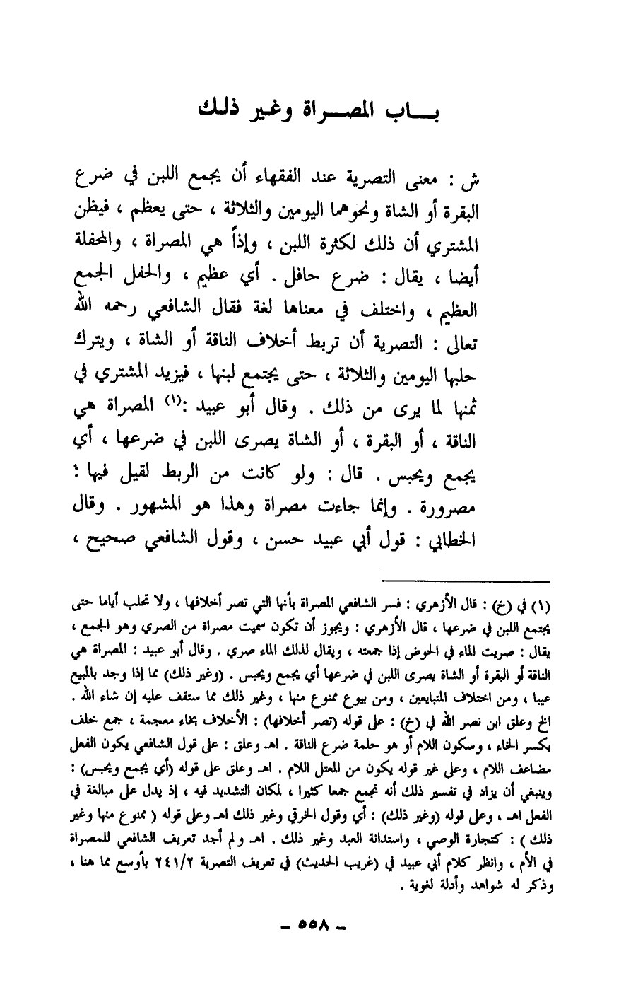 ش: معنى التصرية عند الفقهاء أن يجمع اللبن في ضرع البقرة أو الشاة ونحوهما اليومين والثلاثة، حتى يعظم، فيظن المشتري أن ذلك لكثرة اللبن، وإذا هي المصراة، والمحفلة أيضا، يقال: ضرع حافل. أي عظيم، والحفل الجمع العظيم، واختلف في معناها لغة، فقال الشافعي - رَحِمَهُ اللَّهُ تَعَالَى -: التصرية أن تربط أخلاف الناقة أو الشاة، ويترك حلبها اليومين والثلاثة، حتى يجتمع لبنها، فيزيد المشتري في ثمنها لما يرى من ذلك. وقال أبو عبيد: المصراة هي الناقة، أو البقرة، أو الشاة يصرى اللبن في ضرعها، أي يجمع ويحبس. قال: ولو كانت من الربط لقيل فيها: مصرورة. وإنما جاءت مصراة، وهذا هو المشهور. وقال الخطابي: قول أبي عبيد حسن، وقول الشافعي صحيح،