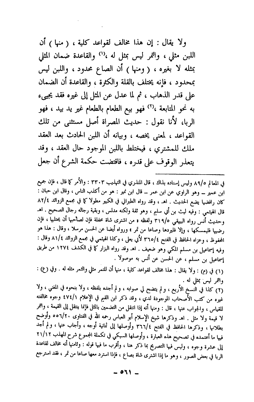 ولا يقال: إن هذا مخالف لقواعد كلية، (منها) أن اللبن مثلي، والتمر ليس بمثل له، والقاعدة ضمان المثلي بمثله لا بغيره، (ومنها) أن الصاع محدود، واللبن ليس بمحدود، فإنه يختلف بالقلة والكثرة، والقاعدة أن الضمان على قدر الذهاب، ثم لما عدل عن المثل إلى غيره فقد يجيء به نحو المتابعة، فهو بيع الطعام بالطعام غير يد بيد، فهو الربا، لأنا نقول: حديث المصراة أصل مستثنى من تلك القواعد، لمعنى يخصه، وبيانه أن اللبن الحادث بعد العقد ملك للمشتري، فيختلط باللبن الموجود حال العقد، وقد يتعذر الوقوف على قدره، فاقتضت حكمة الشرع أن جعل