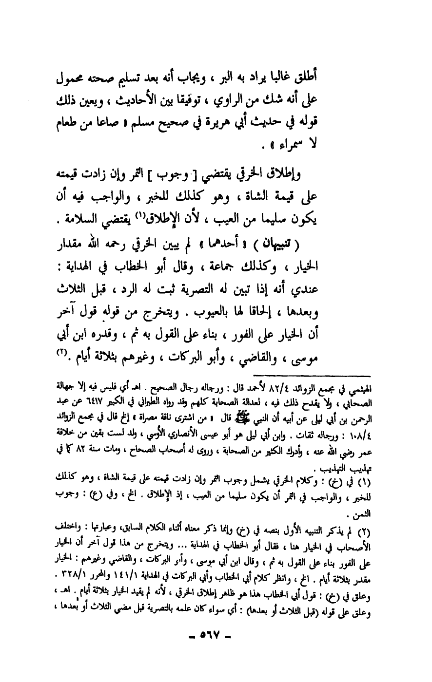 (تنبيهان) : «أحدهما» : لم يبين الخرقي - رَحِمَهُ اللَّهُ - مقدار الخيار، وكذلك جماعة، وقال أبو الخطاب في الهداية: عندي أنه إذا تبين له التصرية ثبت له الرد، قبل الثلاث وبعدها، إلحاقا لها بالعيوب. ويتخرج من قوله قول آخر أن الخيار على الفور، بناء على القول به ثم، وقدره ابن أبي موسى، والقاضي، وأبو البركات، وغيرهم بثلاثة أيام.