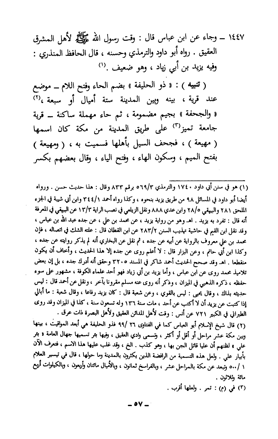 1447 - وجاء عن ابن عباس قال: «وقت رسول الله - صَلَّى اللَّهُ عَلَيْهِ وَسَلَّمَ - لأهل المشرق العقيق» ، رواه أبو داود، والترمذي وحسنه، قال الحافظ المنذري: وفيه يزيد بن أبي زياد، وهو ضعيف.