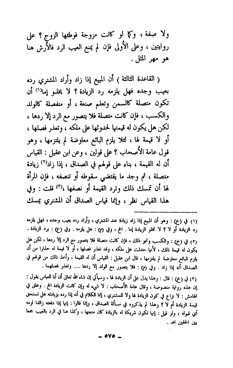 (القاعدة الثالثة) : أن المبيع إذا زاد وأراد المشتري رده بعيب وجده، فهل يلزمه رد الزيادة؟ لا يخلو إما أن تكون متصلة كالسمن وتعلم صنعة، أو منفصلة كالولد والكسب، فإن كانت متصلة فلا يتصور مع الرد إلا ردها، لكن هل يكون له قيمتها لحدوثها على ملكه، وتعذر فصلها، أو لا قيمة لها، لئلا يلزم البائع معاوضة لم يلتزمها، وهو قول عامة الأصحاب؟ على قولين، وعن ابن عقيل: القياس أن له القيمة، بناء على قولهم في الصداق، إذا زاد زيادة متصلة، ثم وجد ما يقتضي سقوطه أو تنصفه، فإن المرأة لها أن تمسك ذلك وترد القيمة أو نصفها، قلت: وفي هذا القياس نظر، وإنما قياس الصداق أن المشتري يمسك