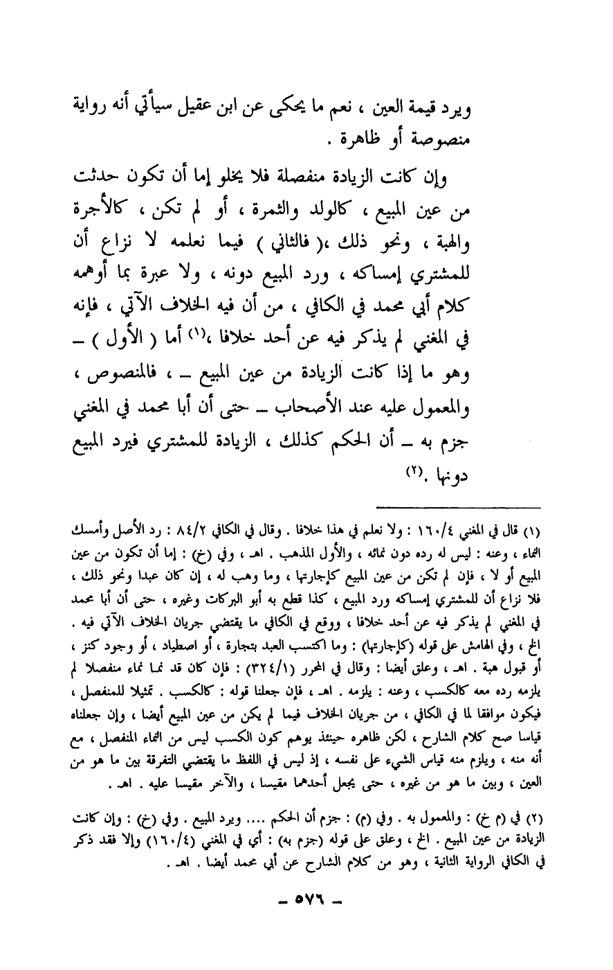 وإن كانت الزيادة منفصلة فلا يخلو إما أن تكون حدثت من عين المبيع، كالولد والثمرة، أو لم تكن، كالأجرة والهبة، ونحو ذلك، (فالثاني) فيما نعلمه لا نزاع أن للمشتري إمساكه، ورد المبيع دونه، ولا عبرة بما أوهمه كلام أبي محمد في الكافي، من أن فيه الخلاف الآتي، فإنه في المغني لم يذكر فيه عن أحد خلافا، أما (الأول) - وهو ما إذا كانت الزيادة من عين المبيع -، فالمنصوص، والمعمول عليه عند الأصحاب - حتى إن أبا محمد في المغني جزم به - أن الحكم كذلك، الزيادة للمشتري فيرد المبيع دونها.
