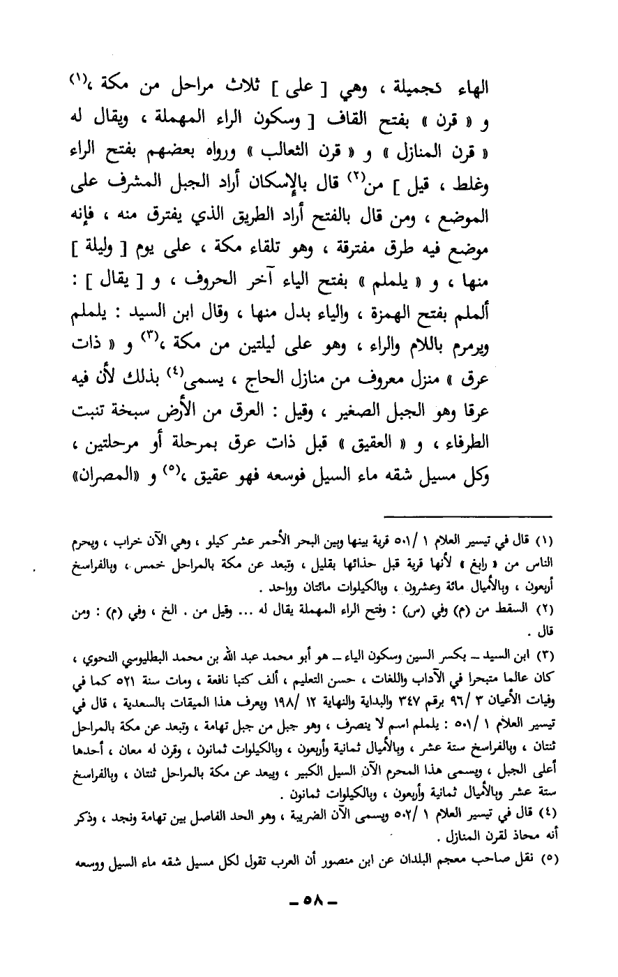 الهاء كجميلة، وهي [على] ثلاث مراحل من مكة، و «قرن» بفتح القاف [وسكون الراء المهملة، ويقال له «قرن المنازل» و «قرن الثعالب» ورواه بعضهم بفتح الراء وغلط، قيل] من قال بالإسكان أراد الجبل المشرف على الموضع، ومن قال بالفتح أراد الطريق الذي يفترق منه، فإنه موضع فيه طرق مفترقة، وهو تلقاء مكة، على يوم [وليلة] منها، و «يلملم» بفتح الياء آخر الحروف، و [يقال] : ألملم بفتح الهمزة، والياء بدل منها، وقال ابن السيد: يلملم ويرمرم باللام والراء، وهو على ليلتين من مكة، و «ذات عرق» منزل معروف من منازل الحاج، يسمى بذلك لأن فيه عرقا وهو الجبل الصغير، وقيل: العرق من الأرض سبخة تنبت الطرفاء، و «العقيق» قبل ذات عرق بمرحلة أو مرحلتين، وكل مسيل شقه ماء السيل فوسعه فهو عقيق، و «المصران»