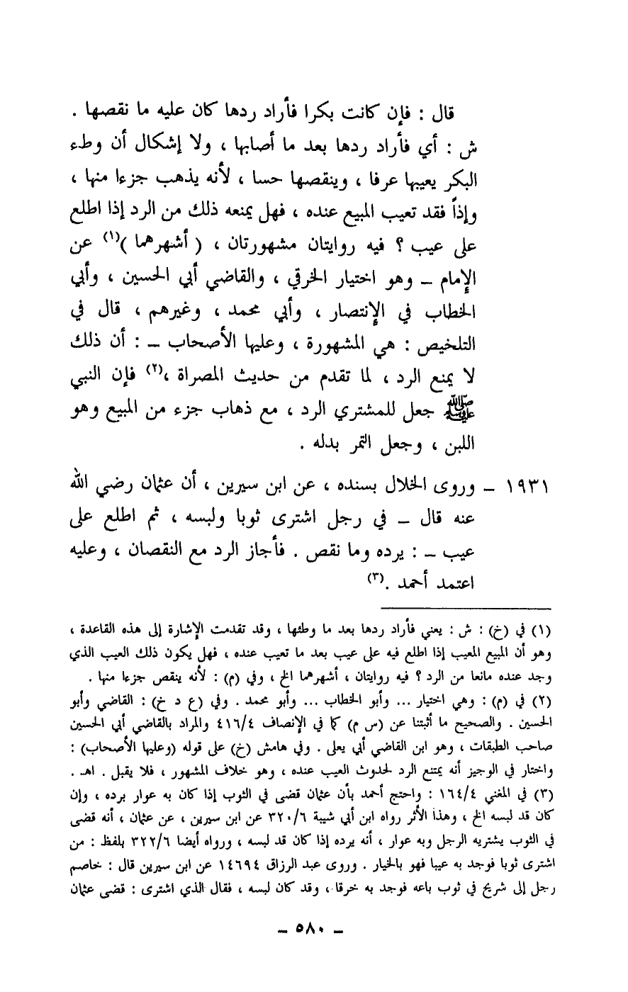 1931 - وروى الخلال بسنده، عن ابن سيرين، أن عثمان - رَضِيَ اللَّهُ عَنْهُ -، قال - في رجل اشترى ثوبا ولبسه، ثم اطلع على عيب -: يرده وما نقص. فأجاز الرد مع النقصان، وعليه اعتمد أحمد.