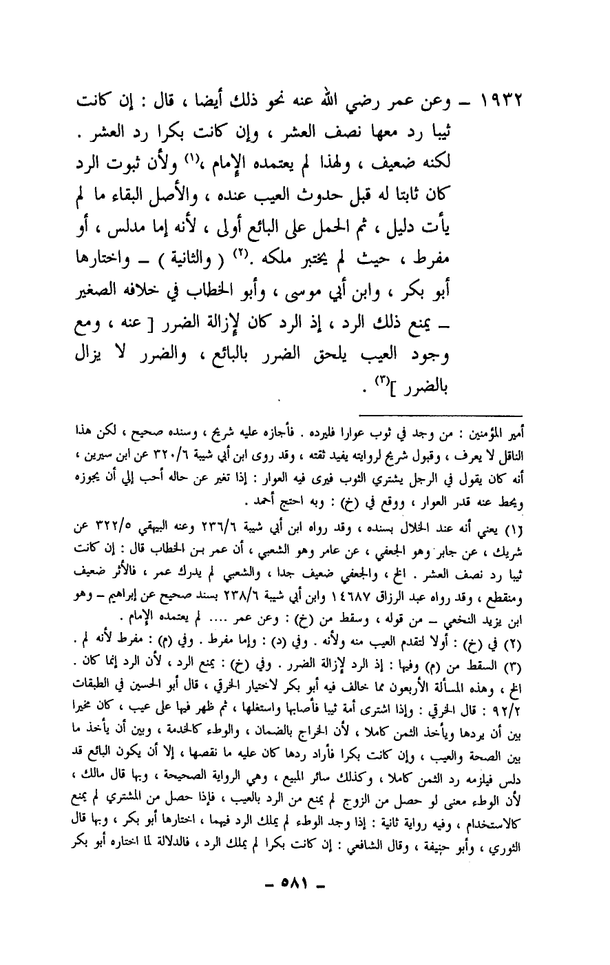 1932 - وعن عمر - رَضِيَ اللَّهُ عَنْهُ - نحو ذلك أيضا، قال: إن كانت ثيبا رد معها نصف العشر، وإن كان بكرا رد العشر. لكنه ضعيف، ولهذا لم يعتمده الإمام، ولأن ثبوت الرد كان ثابتا له قبل حدوث العيب عنده، والأصل البقاء ما لم يأت دليل، ثم الحمل على البائع أولى، لأنه إما مدلس، أو مفرط، حيث لم يختبر ملكه.
