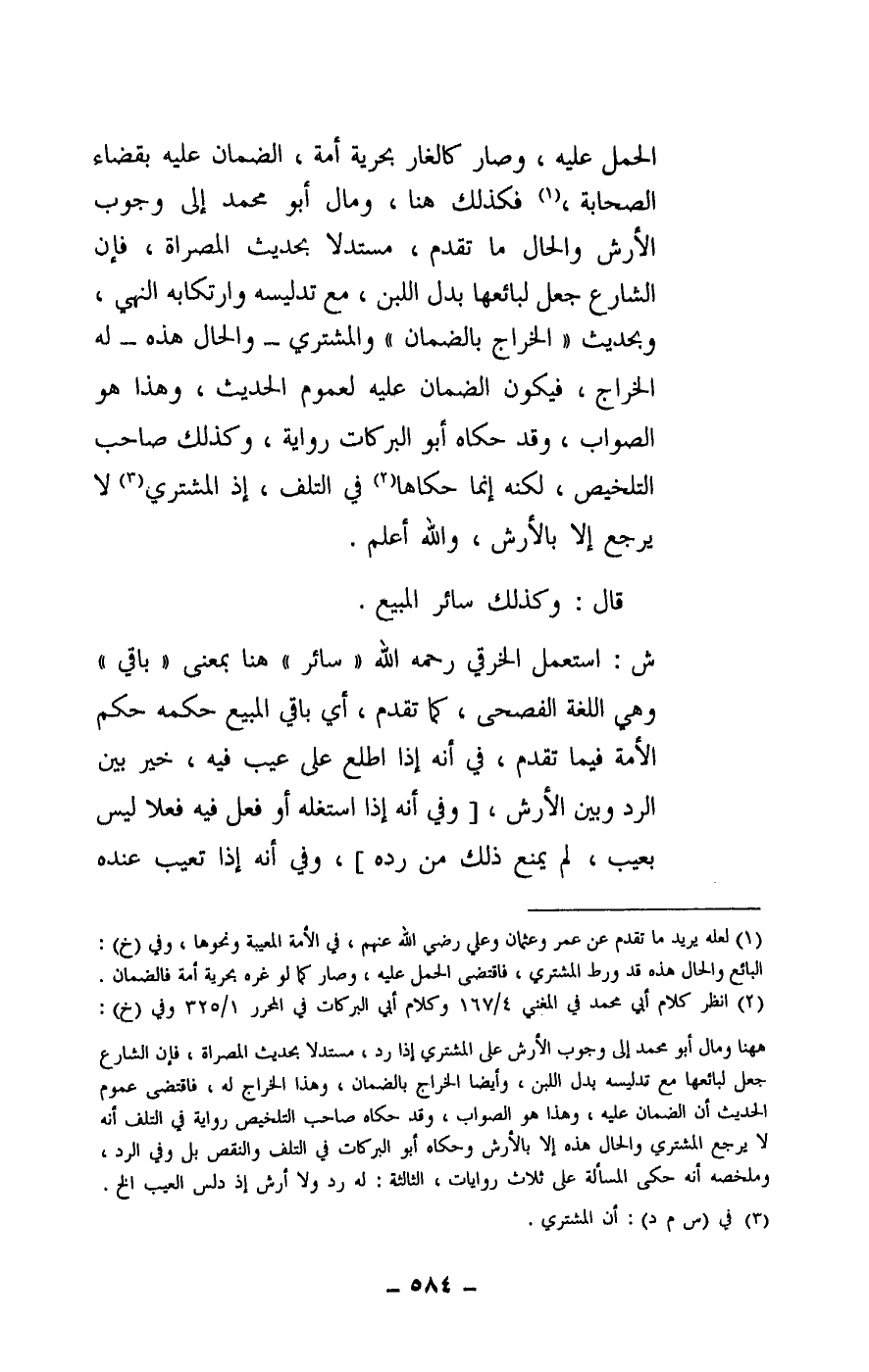 ش: استعمل الخرقي - رَحِمَهُ اللَّهُ - «سائر» هنا بمعنى «باقي» وهي اللغة الفصحى، كما تقدم، أي باقي المبيع حكمه حكم الأمة فيما تقدم، في أنه إذا اطلع على عيب فيه، خير بين الرد وبين الأرش، [وفي أنه إذا استغله أو فعل فيه فعلا ليس بعيب، لم يمنع ذلك من رده] ، وفي أنه إذا تعيب عنده