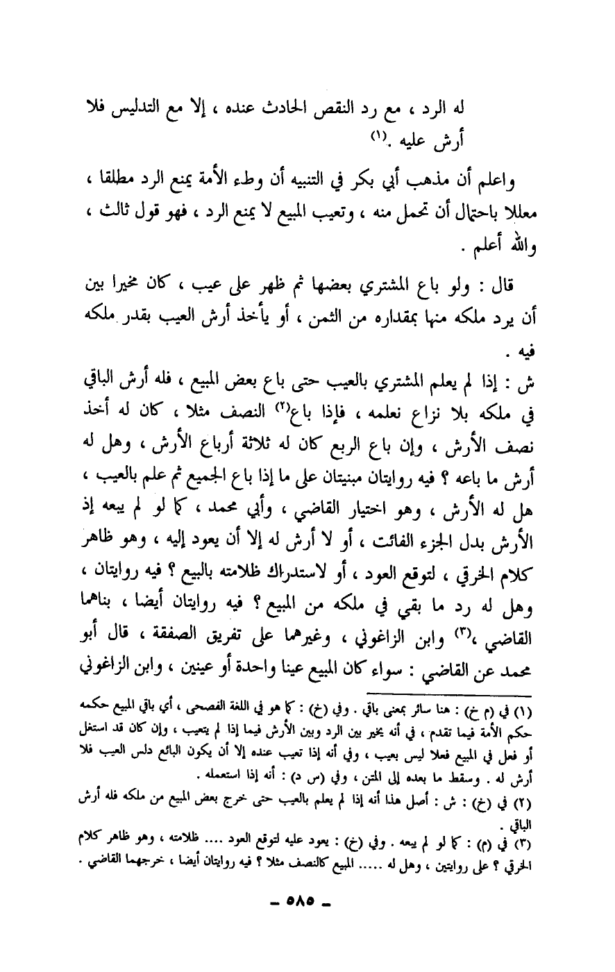 ش: إذا لم يعلم المشتري بالعيب حتى باع بعض المبيع، فله أرش الباقي في ملكه بلا نزاع نعلمه، فإذا باع النصف مثلا، كان له أخذ نصف الأرش، وإن باع الربع كان له ثلاثة أرباع الأرش، وهل له أرش ما باعه؟ فيه روايتان مبنيتان على ما إذا باع الجميع ثم علم بالعيب، هل له الأرش، وهو اختيار القاضي، وأبي محمد، كما لو لم يبعه إذ الأرش بدل الجزء الفائت، أو لا أرش له إلا أن يعود إليه، وهو ظاهر كلام الخرقي، لتوقع العود، أو لاستدراك ظلامته بالبيع؟ فيه روايتان، وهل له رد ما بقي من ملكه من المبيع؟ فيه روايتان أيضا، بناهما القاضي، وابن الزاغون، وغيرهما على تفريق الصفقة، قال أبو محمد عن القاضي: سواء كان المبيع عينا واحدة أو عينين، وابن الزاغوني