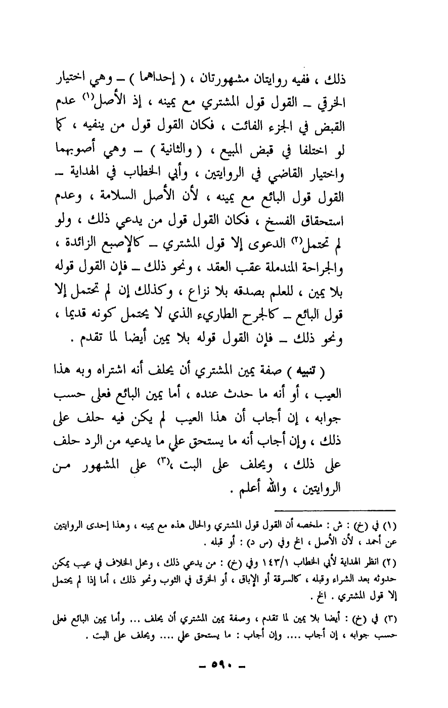 ذلك، ففيه روايتان مشهورتان: (إحداهما) : - وهي اختيار الخرقي - القول قول المشتري مع يمينه، إذ الأصل عدم القبض في الجزء الفائت، فكان القول قول من ينفيه، كما لو اختلفا في قبض المبيع. (والثانية) : - وهي أصوبهما واختيار القاضي في الروايتين، وأبي الخطاب في الهداية - القول قول البائع مع يمينه، لأن الأصل السلامة، وعدم استحقاق الفسخ، فكان القول قول من يدعي ذلك، ولو لم تحتمل الدعوى إلا قول المشتري - كالإصبع الزائدة، والجراحة المندملة عقب العقد، ونحو ذلك - فإن القول قوله بلا يمين، للعلم بصدقه بلا نزاع، وكذلك إن لم تحتمل إلا قول البائع - كالجرح الطارئ الذي لا يحتمل كونه قديما، ونحو ذلك - فإن القول قوله بلا يمين أيضا لما تقدم.