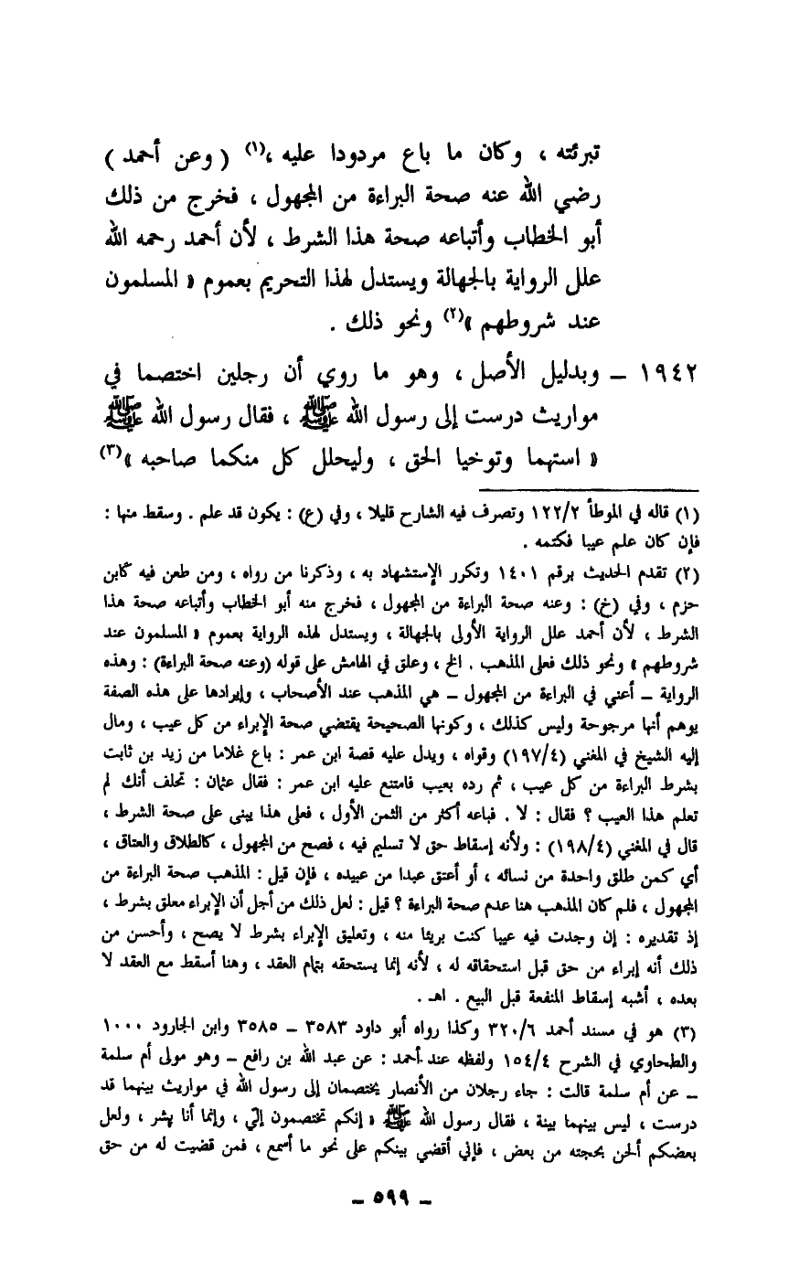 تبرئته، وكان ما باع مردودا عليه، (وعن أحمد) - رَضِيَ اللَّهُ عَنْهُ - صحة البراءة من المجهول، فخرج من ذلك أبو الخطاب وأتباعه صحة هذا الشرط، لأن أحمد - رَحِمَهُ اللَّهُ - علل الرواية بالجهالة ويستدل لهذا التحريم بعموم «المسلمون عند شروطهم» ونحو ذلك.