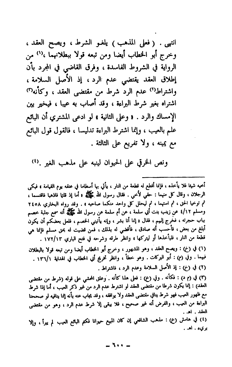 (فعلى المذهب) يلغو الشرط، ويصح العقد، وخرج أبو الخطاب أيضا ومن تبعه قولا ببطلانهما، من الرواية في الشروط الفاسدة، وفرق القاضي في المجرد بأن إطلاق العقد يقتضي عدم الرد، إذ الأصل السلامة، واشتراط عدم الرد شرط من مقتضى العقد، وكأنه اشتراه بغير شرط البراءة، وقد أصاب به عيبا، فيخير بين الإمساك والرد. «وعلى الثانية» لو ادعى المشتري أن البائع علم بالعيب، وإنما اشترط البراءة تدليسا، فالقول قول البائع مع يمينه، ولا تفريع على الثالثة.