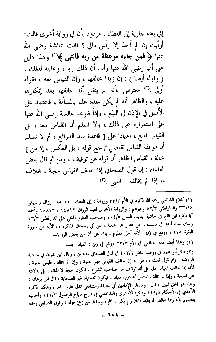 إني بعته جارية إلى العطاء. مردود بأن في رواية أخرى قالت: أرأيت إن لم آخذ إلا رأس مالي؟ قالت عائشة - رَضِيَ اللَّهُ عَنْهَا -: {فَمَنْ جَاءَهُ مَوْعِظَةٌ مِنْ رَبِّهِ فَانْتَهَى} [البقرة: 275] وهذا دليل على أنها - رَضِيَ اللَّهُ عَنْهَا - رأت أن ذلك ربا، وعابته لذلك، (وقوله أيضا) : إن زيدا خالفها، وإن القياس معه، فقوله أولى. معترض بأنه لم ينقل أنه خالفها بعد إنكارها عليه، والظاهر أنه لم يكن عنده علم بالمسألة، فاعتمد على الأصل في الإذن في البيع، وإذا فتوعد عائشة - رَضِيَ اللَّهُ عَنْهَا - على استمراره على ذلك، ولا نسلم أن القياس معه، بل القياس المنع، اعتمادا على [قاعدة سد الذرائع، ثم لا نسلم أن موافقة القياس تقتضي ترجح قوله، بل العكس، إذ من] خالف القياس الظاهر أن قوله عن توقيف، ومن ثم قال بعض العلماء: إن قول الصحابي إذا خالف القياس حجة، بخلاف ما إذا لم يخالفه. انتهى.