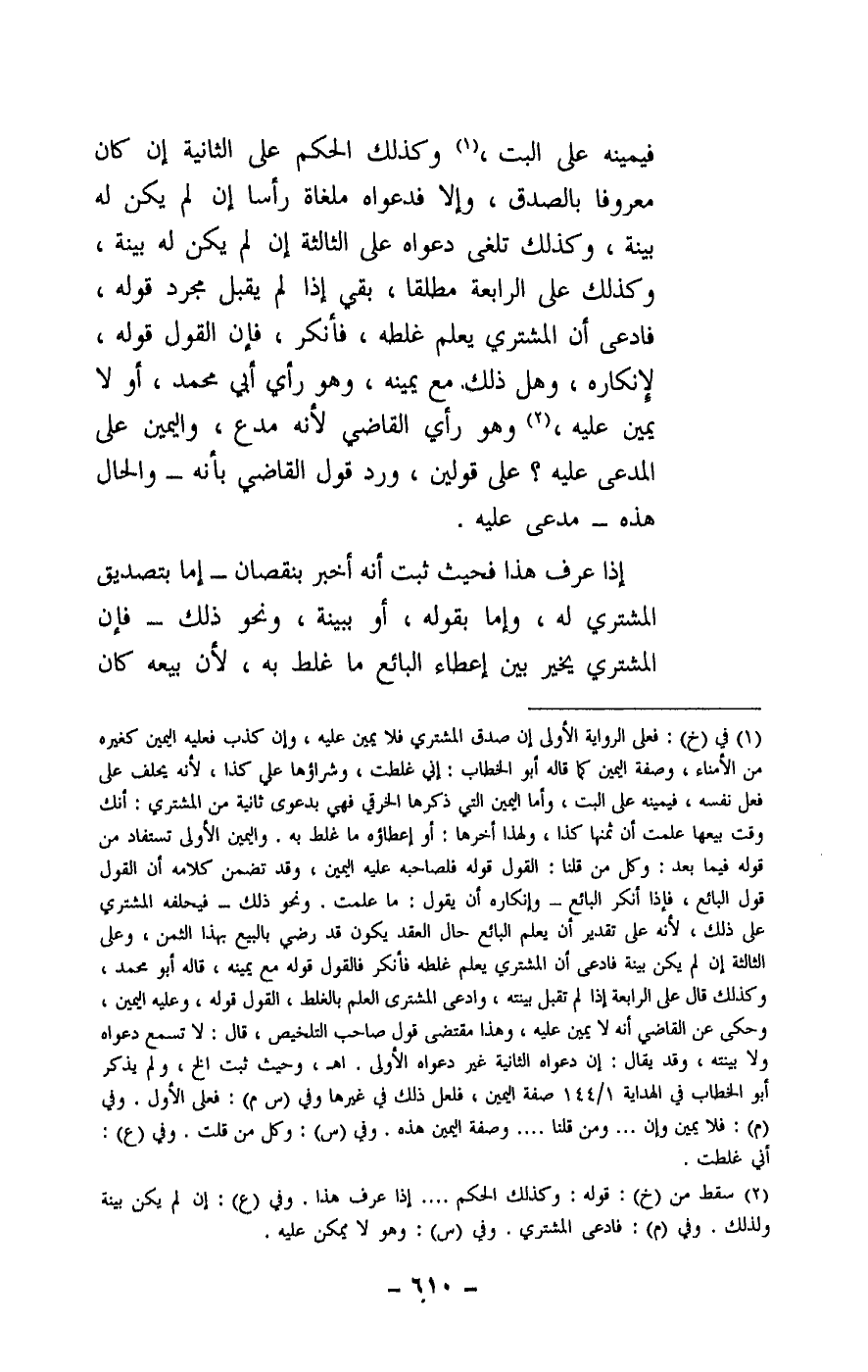 فيمينه على البت، وكذلك الحكم على الثانية إن كان معروفا بالصدق، وإلا فدعواه ملغاة رأسا إن لم يكن له بينة، وكذلك تلغى دعواه على الثالثة إن لم يكن له بينة، وكذلك على الرابعة مطلقا، بقي إذا لم يقبل مجرد قوله، فادعى أن المشتري يعلم غلطه، فأنكر، فإن القول قوله، لإنكاره، وهل ذلك مع يمينه، وهو رأي أبي محمد، أو لا يمين عليه، وهو رأي القاضي لأنه مدع، واليمين على المدعى عليه؟ على قولين، ورد قول القاضي بأنه - والحال هذه - مدعى عليه.