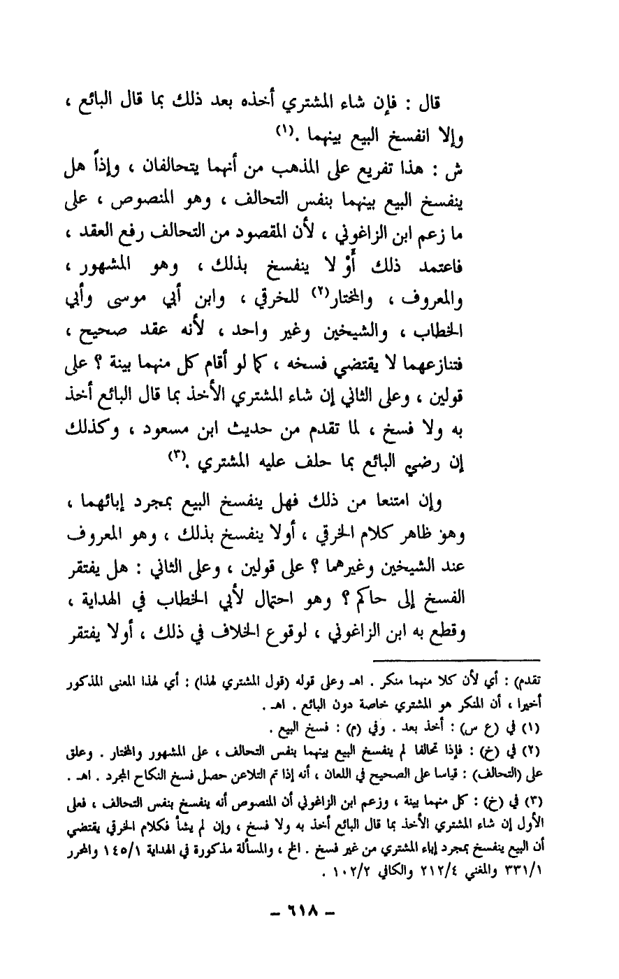 ش: هذا تفريع على المذهب من أنهما يتحالفان، وإذا هل ينفسخ البيع بينهما بنفس التحالف، وهو المنصوص، على ما زعم ابن الزاغوني، لأن المقصود من التحالف رفع العقد، فاعتمد ذلك أو لا ينفسخ بذلك، وهو المشهور، والمعروف، والمختار للخرقي، وابن أبي موسى، وأبي الخطاب، والشيخين وغير واحد، لأنه عقد صحيح، فتنازعهما لا يقتضي فسخه، كما لو أقام كل منهما بينة؟ على قولين، وعلى الثاني إن شاء المشتري الأخذ بما قال البائع أخذ به ولا فسخ، لما تقدم من حديث ابن مسعود، وكذلك إن رضي البائع بما حلف عليه المشتري.