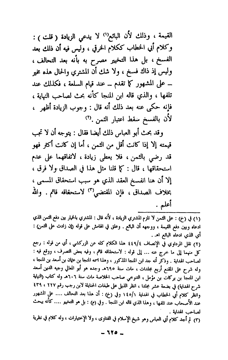 القيمة، وذلك لأن البائع لا يدعي الزيادة (قلت) : وكلام أبي الخطاب ككلام الخرقي، وليس فيه أن ذلك بعد الفسخ، بل هذا التخيير مصرح به بأنه بعد التحالف، وليس إذ ذاك فسخ، ولا شك أن المشتري والحال هذه مخير - على المشهور كما تقدم - عند قيام السلعة، فكذلك عند تلفها، والذي قاله ابن المنجا كأنه بحث لصاحب النهاية، فإنه حكى عنه بعد ذلك أنه قال: وجوب الزيادة أظهر لأن بالفسخ سقط اعتبار الثمن.