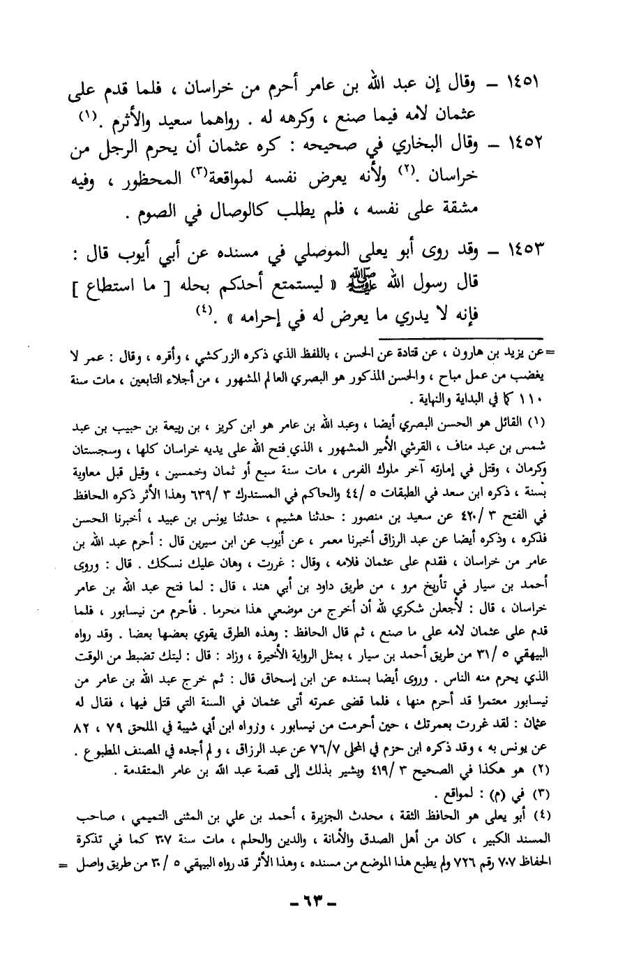 1451 - وقال إن عبد الله بن عامر أحرم من خراسان، فلما قدم على عثمان لامه فيما صنع، وكرهه له. رواهما سعيد، والأثرم.