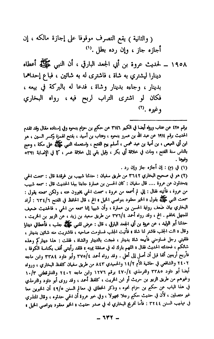 1958 - لحديث «عروة بن أبي الجعد البارقي، أن النبي - صَلَّى اللَّهُ عَلَيْهِ وَسَلَّمَ - أعطاه دينارا ليشتري به شاة، فاشترى له به شاتين، فباع إحداهما بدينار، وجاءه بدينار وشاة، فدعا له بالبركة في بيعه، فكان لو اشترى التراب لربح فيه» ، رواه البخاري وغيره.