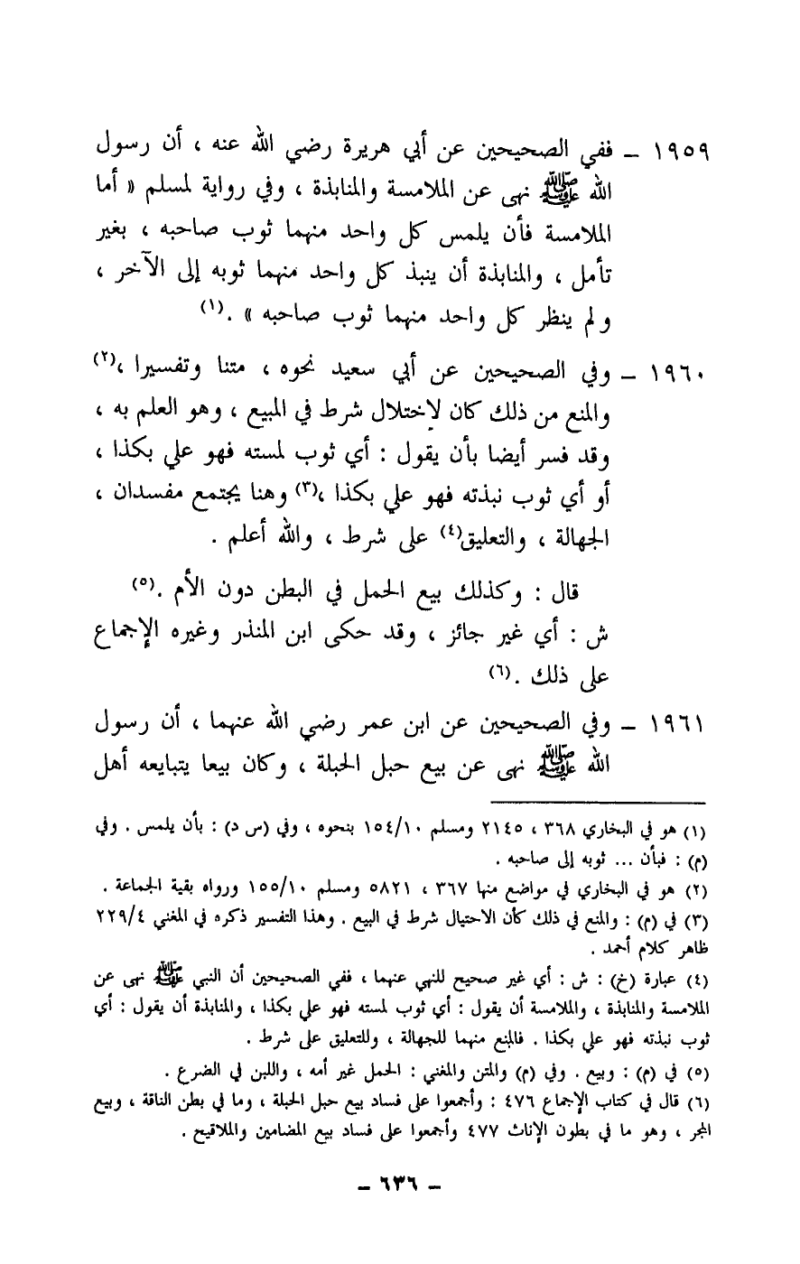 1959 - ففي الصحيحين عن أبي هريرة - رَضِيَ اللَّهُ عَنْهُ -، «أن رسول الله - صَلَّى اللَّهُ عَلَيْهِ وَسَلَّمَ - نهى عن الملامسة والمنابذة» ، وفي رواية لمسلم «أما الملامسة فأن يلمس كل واحد منهما ثوب صاحبه، بغير تأمل، والمنابذة أن ينبذ كل واحد منهما ثوبه إلى الآخر، ولم ينظر كل واحد منهما ثوب صاحبه» .