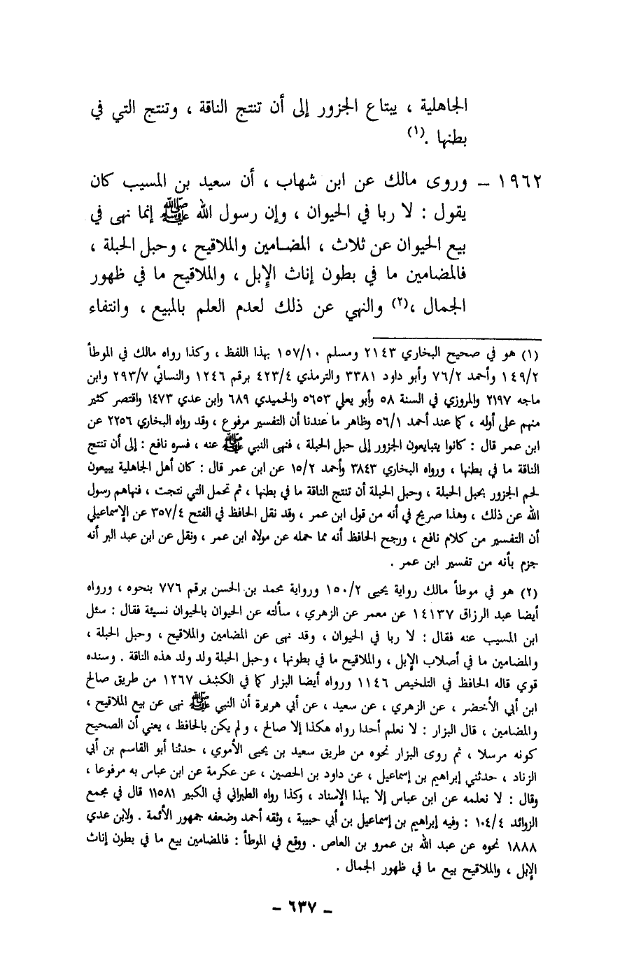 1962 - وروى مالك عن ابن شهاب، أن سعيد بن المسيب كان يقول: لا ربا في الحيوان، «وإن رسول الله - صَلَّى اللَّهُ عَلَيْهِ وَسَلَّمَ - إنما نهى في بيع الحيوان عن ثلاث، المضامين والملاقيح، وحبل الحبلة» ، فالمضامين ما في بطون إناث الإبل، والملاقيح ما في ظهور الجمال، والنهي عن ذلك لعدم العلم بالمبيع، وانتفاء