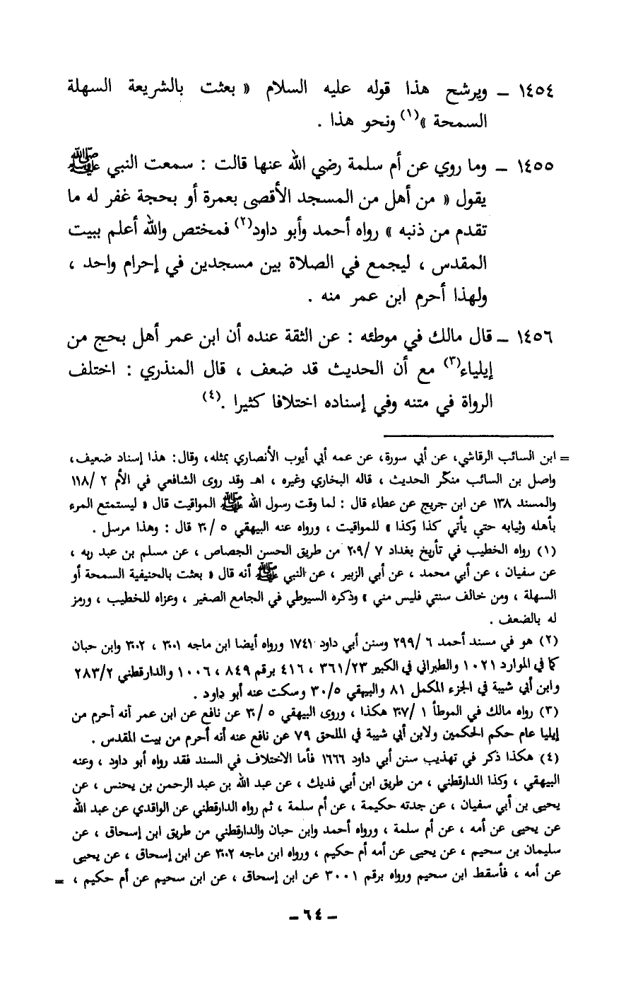 1455 - وما روي عن أم سلمة – - رَضِيَ اللَّهُ عَنْهَا - قالت: سمعت النبي - صَلَّى اللَّهُ عَلَيْهِ وَسَلَّمَ - يقول «من أهل من المسجد الأقصى بعمرة أو بحجة غفر له ما تقدم من ذنبه» رواه أحمد، وأبو داود فمختص والله أعلم ببيت المقدس، ليجمع في الصلاة بين مسجدين في إحرام واحد، ولهذا أحرم ابن عمر منه.